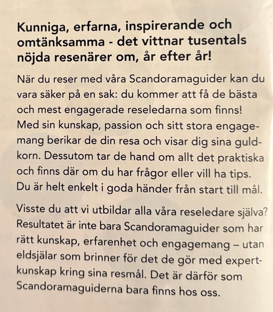 Jag blev riktigt uppmuntrad när jag läste texten de skrivit om oss. Inte utan att jag känner tacksamhet över att arbeta som reseledare och guide på just Scandorama.