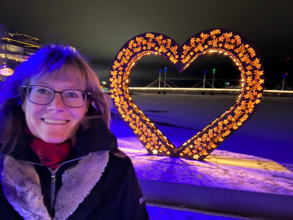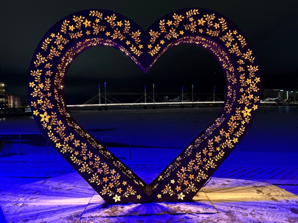 Ikväll har jag varit inne i Jönköping city och träffat en god vän över en fika. Vi fick en trevlig pratstund. Det var så mysigt och fortfarande finns en del julbelysning kvar. Detta fina lysande hjärta är tillverkat av cortenstål. Det fanns inför julen 2024 på Vindbron. Nu finns det vid Lillsjöplan. Man får en trevlig vy över Munksjöbron när man tittar genom hjärtat. Så positivt med detta fina hjärta intill Munksjön! Hjärtat är en symbol för kärlek men också för vänskap och medkänsla. Det tycker jag passar fint i vår härliga stad Jönköping som vi älskar mycket.
