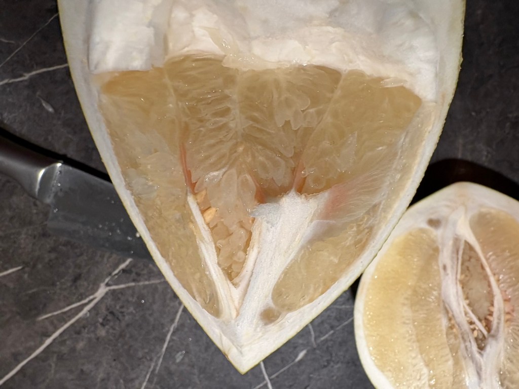 Den har ganska tjocka skal. Jag försökte klyfta upp den men fick också skära bort skalet runt varje klyfta. Det var för segt att äta. Jag vet inte riktigt hur jag ska beskriva smakupplevelsen. Frukten var inte särskilt saftig men inte heller riktigt träig utan ett mellanting. Den smakade ganska gott men var ingen sensation. Den var inte lika besk som grapefrukten utan lite sötare.