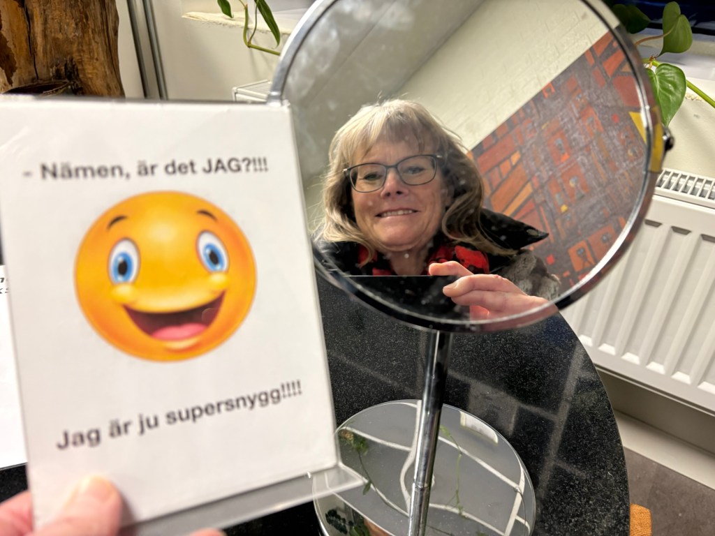 Ikväll har jag varit på massage. När jag satt och väntade på att få komma in fick jag se denna underbara skylt och en spegel mitt på bordet. Jag kunde inte låta bli utan tog ett foto. Så fin uppmuntran för alla som sitter här och väntar! Så’nt här gillar jag.