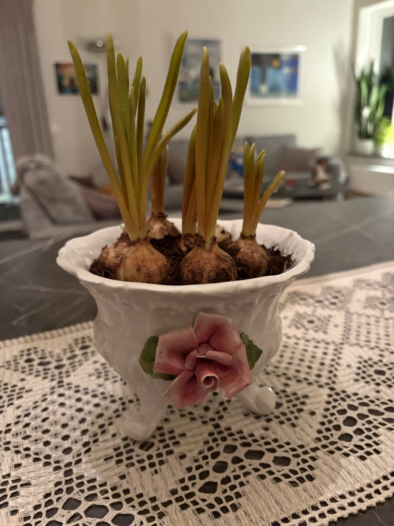 När jag städat ut julen ville jag få in lite vårkänslor i mitt hem. Jag köpte några pärlhyacinter som jag planterade i en romantisk kruka som jag fick ärva efter mamma. Jag njuter redan av detta vackra och ännu härligare kommer det att bli när pärlhyacinterna har slagit ut. De doftar ljuvligt.