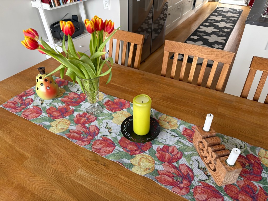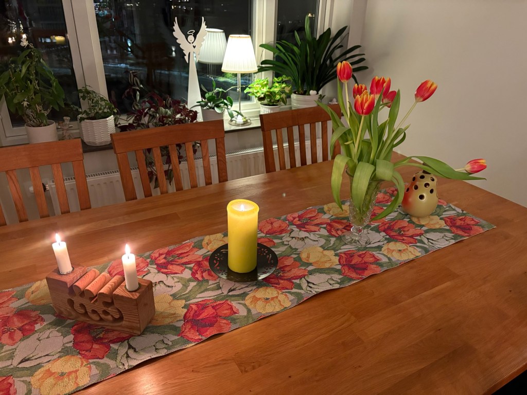Jag köpte säsongens första tulpanbukett och njuter i fulla drag. Både dagtid och kvällstid blir det mysigt men på olika sätt. Det behövs lite vårglädje nu när julen är utstädad. Allting har sin tid. Det är fortfarande mörkt ute på kvällarna och då blir det mycket tid för innemys. Det är rofyllt och skönt.