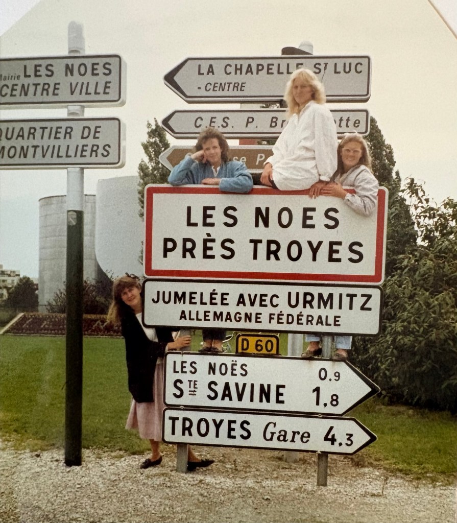 Det har nu gått 38 år sen dess. Vi ”flickor” har haft en hel del kontakt under årens lopp och i helgen ses vi alltså här hos Anette i Skara. Vi blev ofta kallade ”les quatres filles suédoises” (de fyra svenska flickorna) och med glimten i ögat kallar vi oss det fortfarande. Här kommer några bilder från 1988. Bild 1: Vi sjunger och spelar, Bild 2: Flickorna placerade vid några vägskyltar. Vi bodde i Les Noes som är en av Troyes stadsdelar. Bild 3: Den sista gudstjänsten i kyrkan då vi avtackades och fick presenter.