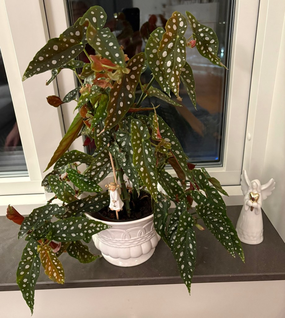 Jag är så glad att min Forellbegonia har vuxit sig så stor och grann. Jag fick den som en liten planta när en god vän hade tänkt göra sig av med den. Jag gillar forellbegonior. 💚💚💚 Växtkraft och glädje! 😃 På latin heter växten Begonia maculata.
