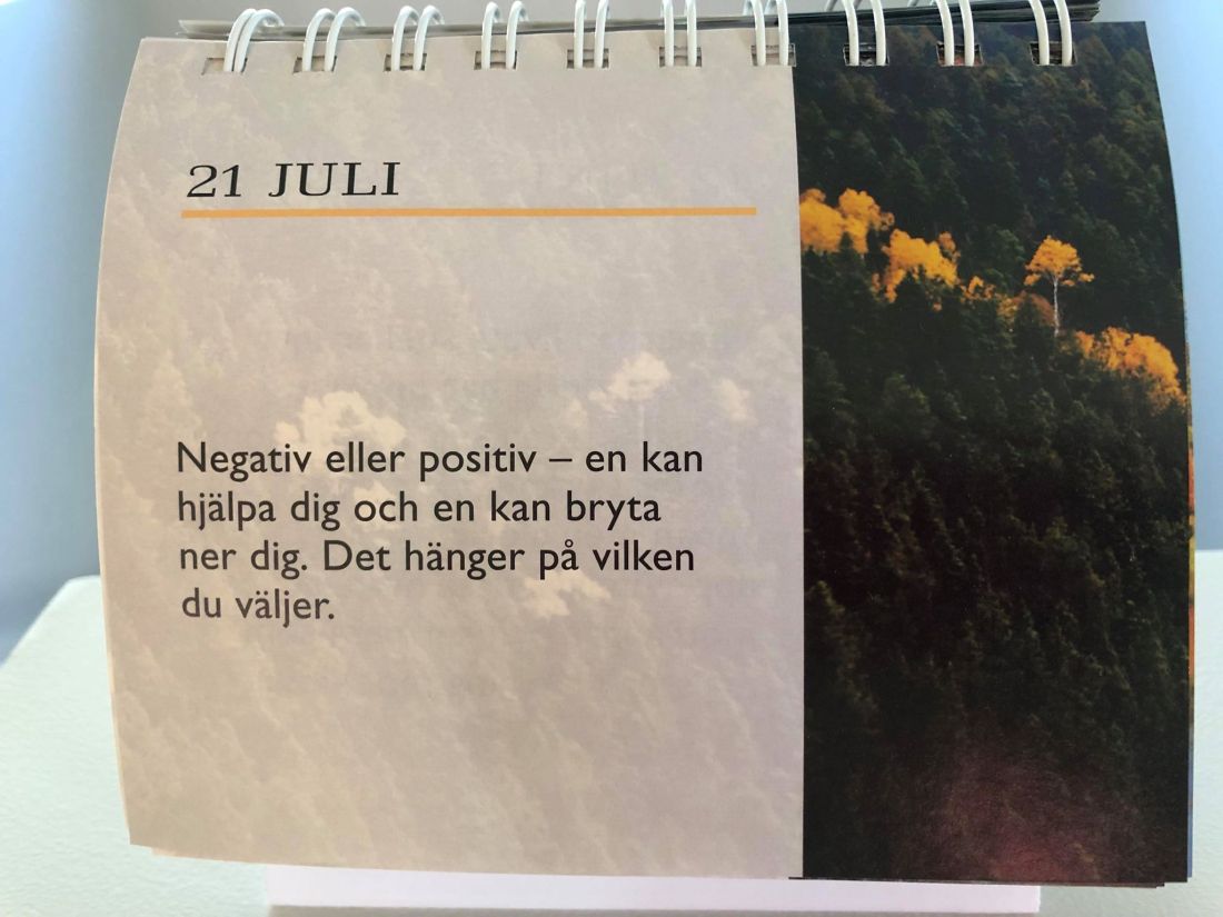Varje dag har vi ett val. Vi lever alla mitt uppe i våra olika omständigheter som skiftar. Hur omständigheterna än ser ut har jag ett val. Jag väljer hur jag ska tänka kring det som händer mig. Detta påverkar min dag och min framtid. Jag vill välja att vara positiv vad som än händer. Det kommer att hjälpa mig att reda ut de stormar jag möter under livsresan.