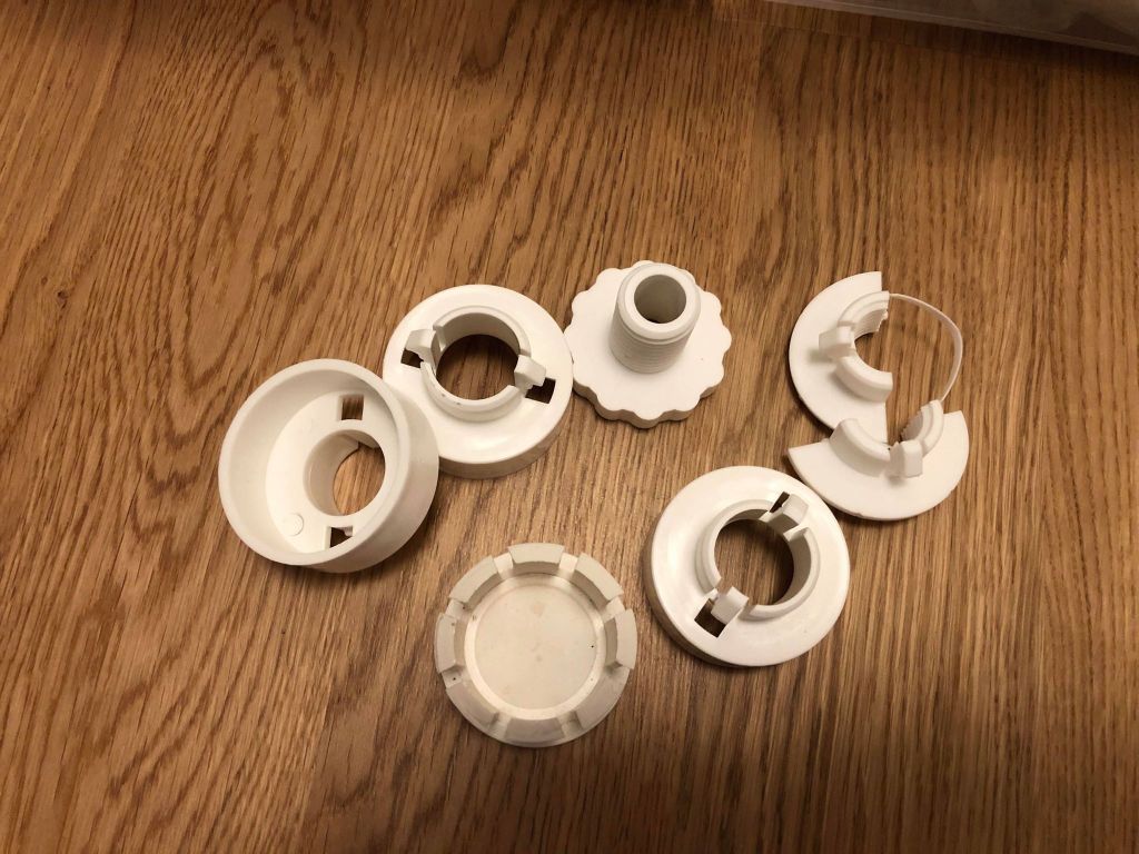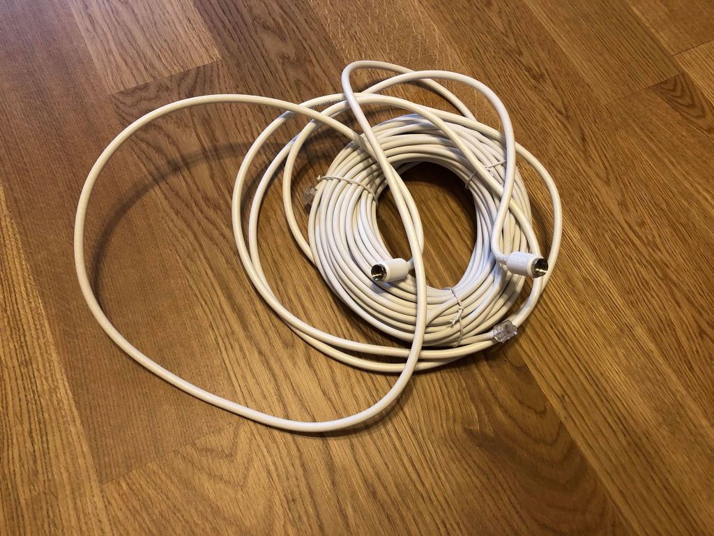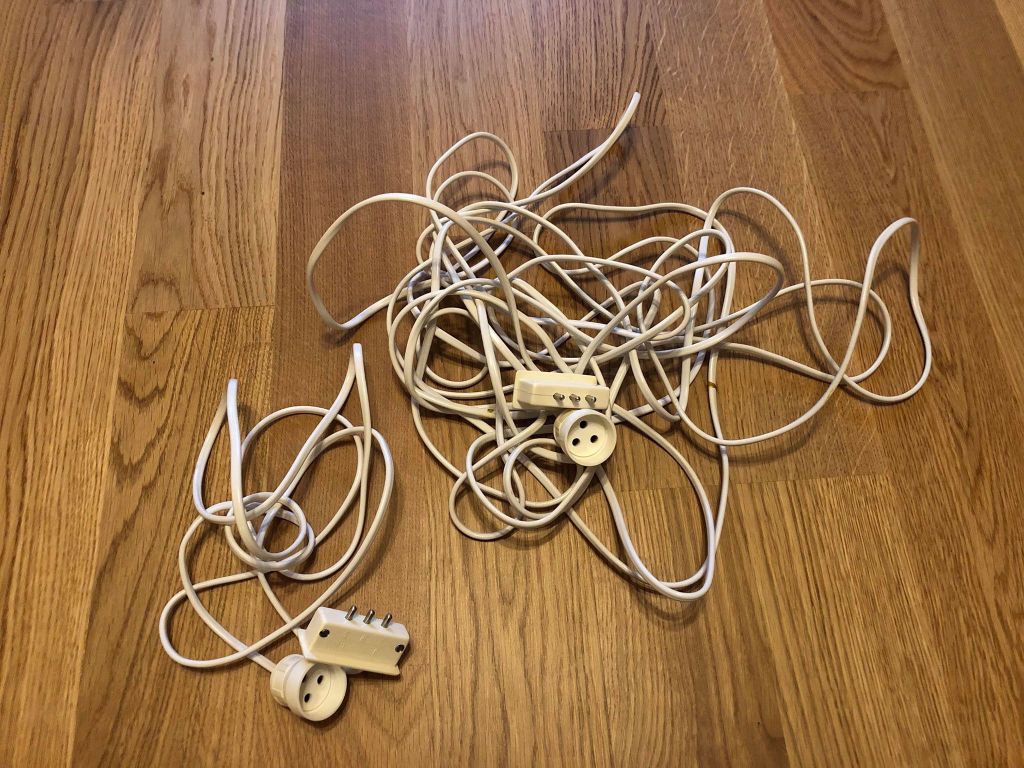 Jag hittar även andra sladdar och grejer. Antennsladdarna behöver jag nog inte längre heller. Jag funderar ett tag till innan jag gör mig av med dem. Känns bra att ta det i etapper. Hittar även ett par sladdar som kanske har använts till lampor men har ingen aning om när och hur jag använde dem. Har också hittat några vita plastgrejer som jag inte vet vad det är. Någon som vet?