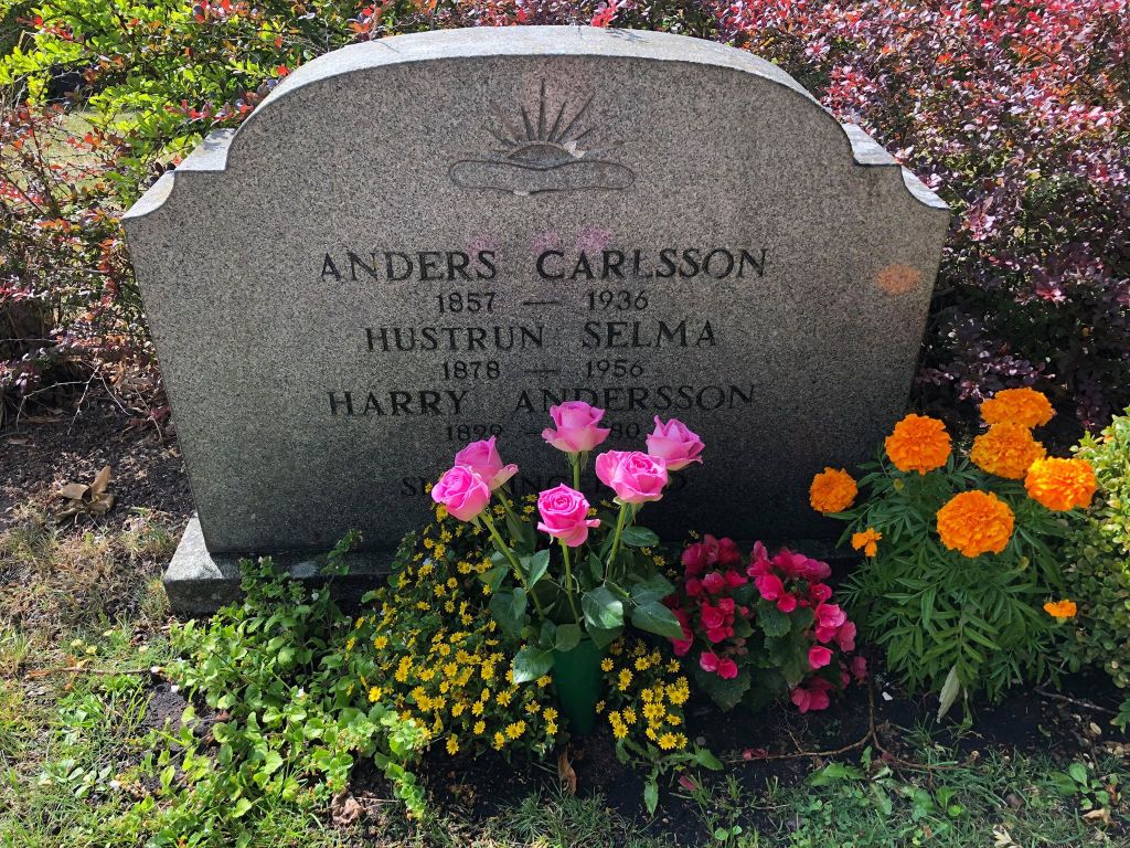 Mammas farmor och farfar fick också några rosor. Jag har aldrig träffat dem men kommer att få göra det en dag på andra sidan. Selma och Anders Karlsson, Slättingebygd. I denna grav finns också mammas farbror Harry som jag träffade många gånger. Han bodde också i Slättingebygd, min barndoms by.