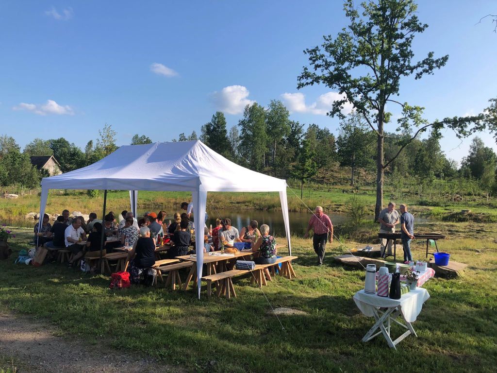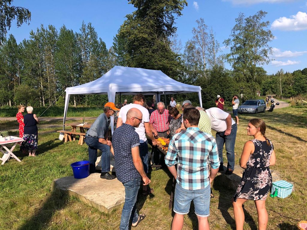 Ikväll var det dags för den årliga byfesten med grillning i Skärshult. Hans trevliga grannar, Annika och Christer, bjöd in till sommarfest på sin gård. Flera hjälpsamma grannar bidrog med en hjälpande hand för att fixa partytält, tårta m m. Vi satt intill dammen och njöt av det trevliga sällskapet i den helt underbara sommarkvällen.
