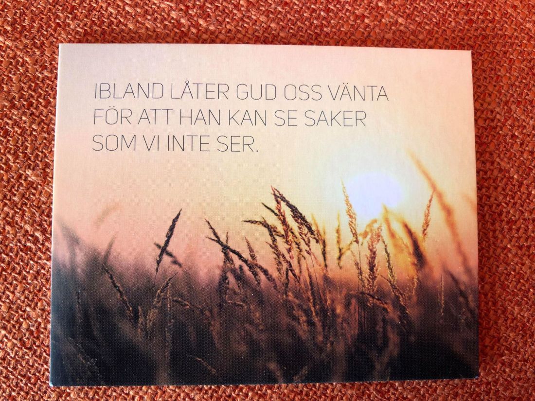 Ibland låter Gud oss vänta för att han kan se saker som vi inte ser. Denna text är så sann. Vi kan önska oss en massa olika saker men frågan är vad som är gott för oss just nu. Gud ser framtiden och har hela ditt liv i sin hand. Vila i din väntan och lita på att allt kommer i rätt tid.