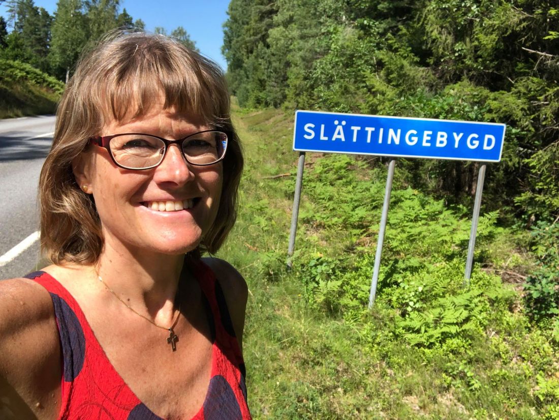 På min väg från Nybro hem till Jönköping åkte jag över Äskebäck – Alsterbro för att hämta mina betongkrukor hos Gunilla och då passerade jag Slättingebygd – min barndoms by. Solen sken och det var så vackert. Jag var bara tvungen att stanna till och andas några minuter och ta en selfie vid Slättingebygd-skylten.