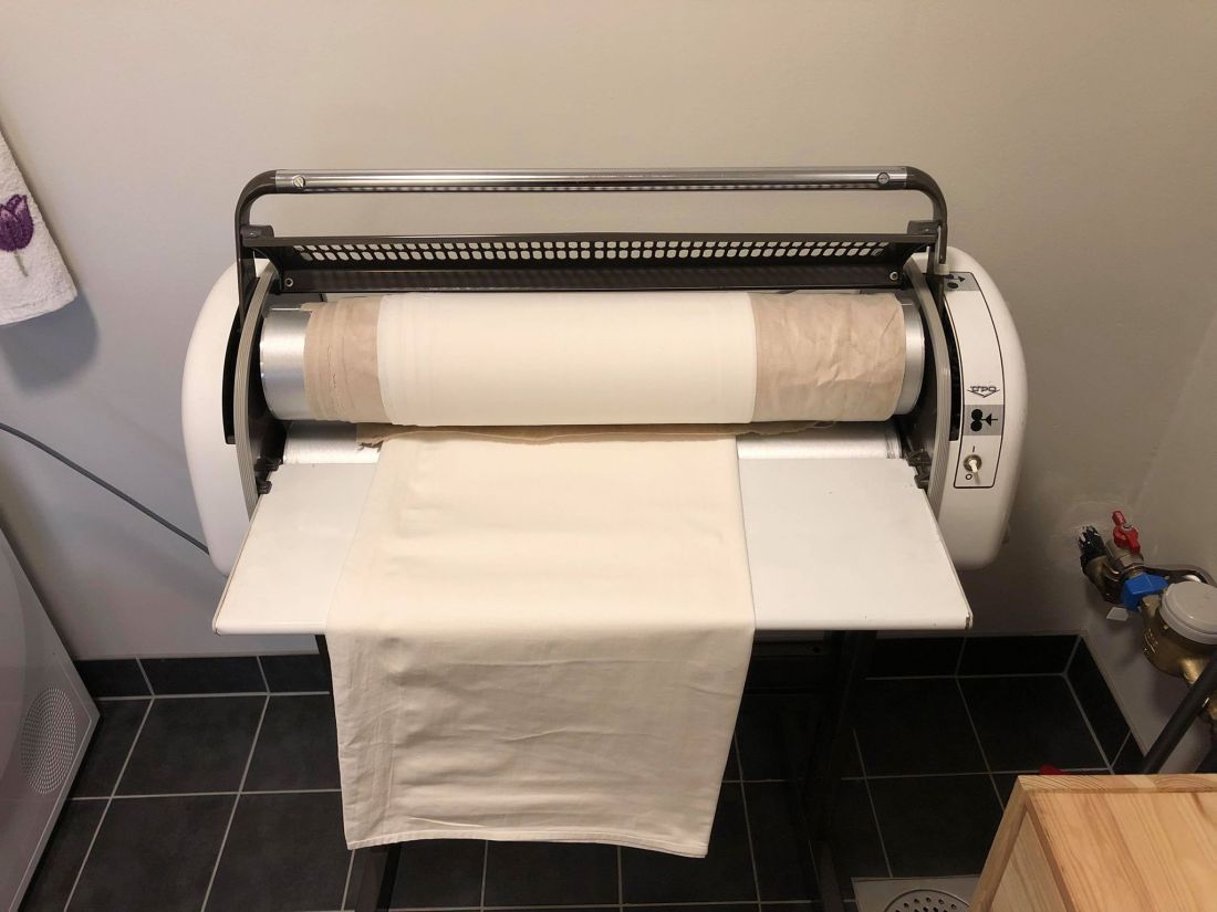Oh, vad jag känner mig nöjd och glad! När mamma sålde huset i Slättingebygd fick Hans och jag ta med oss deras mangel som vi då ställde i källaren i Skärshult. Där fanns en annan mangel men vi lyckades härbärgera även denna. Nu äntligen är den på plats här i vårt nya hus och ikväll har jag manglat. Så skönt att få lägga sig i nymanglade, väldoftande lakan. Lyx!