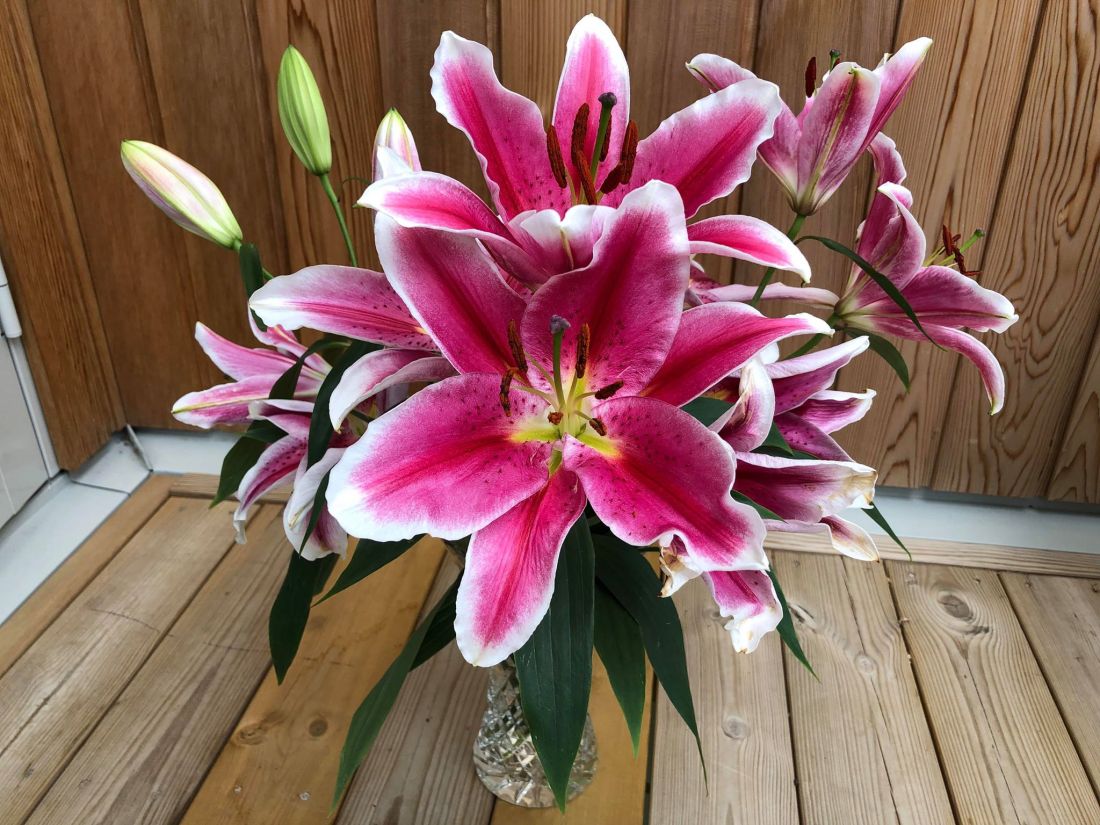 I lördags fick vi jättefina liljor av några goda vänner som var på besök. Vi förundrades redan på söndagen över hur stora, fina och maffiga de var och även starkt doftande. När måndagen kom gick det inte att ha dem inomhus. De doftade gott men otroligt starkt. De fick då en hörnplats på balkongen där de gör sig riktigt bra och de syns så fint inifrån också. Dubbel glädje helt enkelt! Idag började det dock blåsa och regna så jag fick stötta upp lite med vattenkannan. Vilken tur att vi har en rosa vattenkanna. Den matchar ju liljorna perfekt.