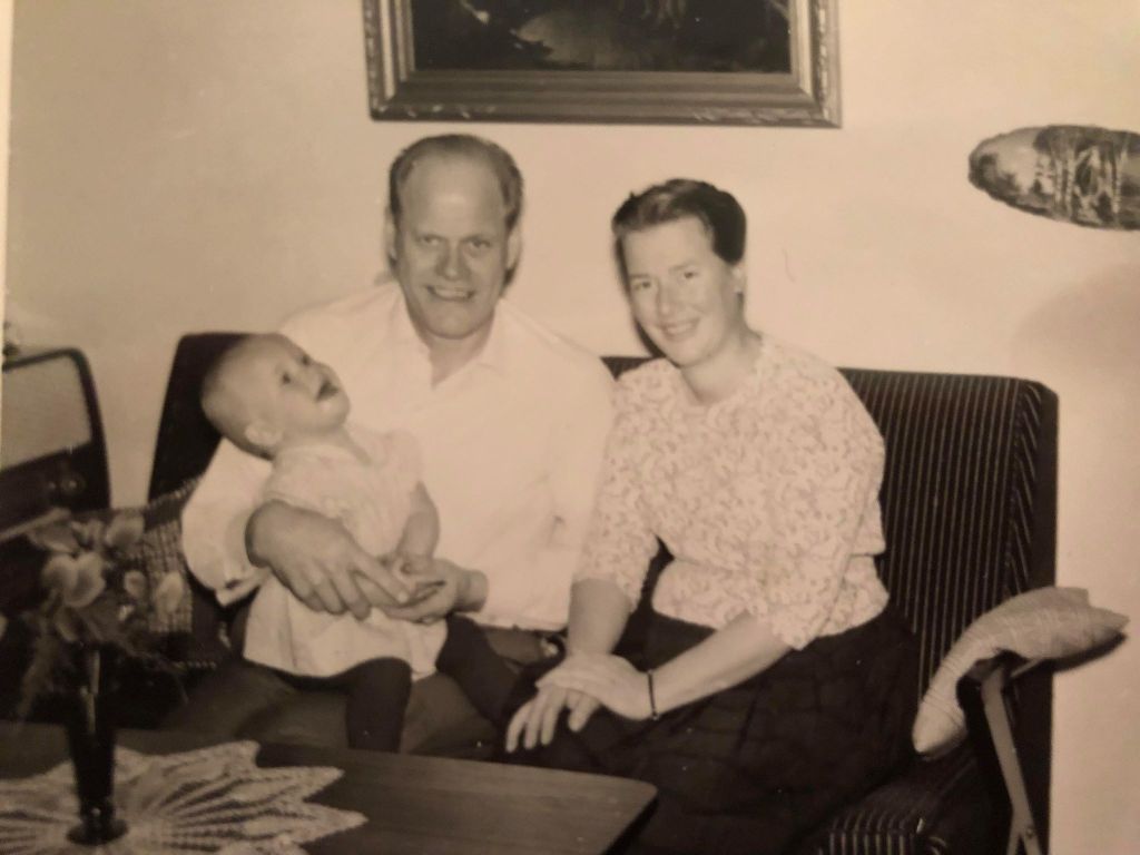 Här kommer två bilder från år 1964. På den första sitter pappa, mamma och jag i vår röda soffa. På den andra bilden sitter pappa, min bror Tomas och jag ute i trädgården. Tomas, som hade en hjärnskada, dog när han var 14 år.