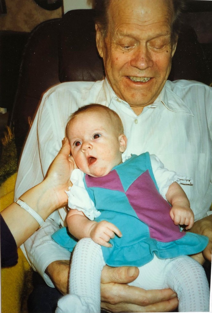 På följande kort firar vi pappas 75-årsdag i september 1994 och på nästa bild har pappa fått sitt första lilla barnbarn Emilia. Hon föddes den 21 september och bilden är tagen i november. Pappa var så förtjust i henne och hon förgyllde hans liv.