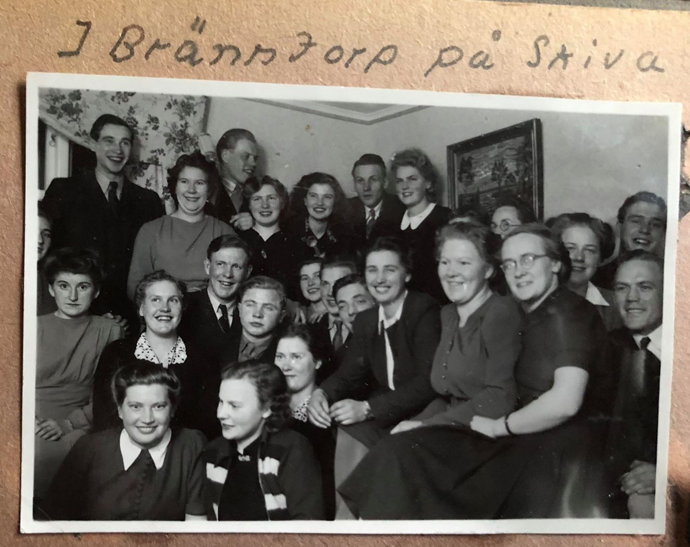 Jag avslutar med en bild från en ”skiva” i Bränntorp där pappas syster Ingrid och svåger Georg bodde. Vilket underbart gäng! Jag känner igen flera av pappas syskon och vänner. Det ger glädje i hjärtat.