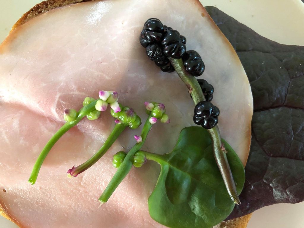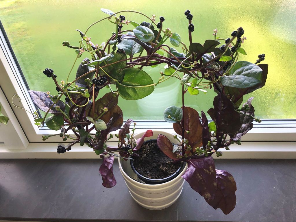 I helgen när vi besökte vännen Lena i Motala så hade hon en Malabarspenat som var jättestor och hon klippte av blad och rosa blommor till salladen vi skulle äta. Då vågade jag smaka och det var riktigt gott. Efter att ha besökt Blomsterlandet ännu en gång för att fråga om man även kan äta de svarta bären/blommorna och hon svarade att hela växten är ätlig så har jag börjat skörda och inmundiga denna växt. Den är väldigt nyttig då den innehåller A- och C-vitaminer, järn och antioxidanter.