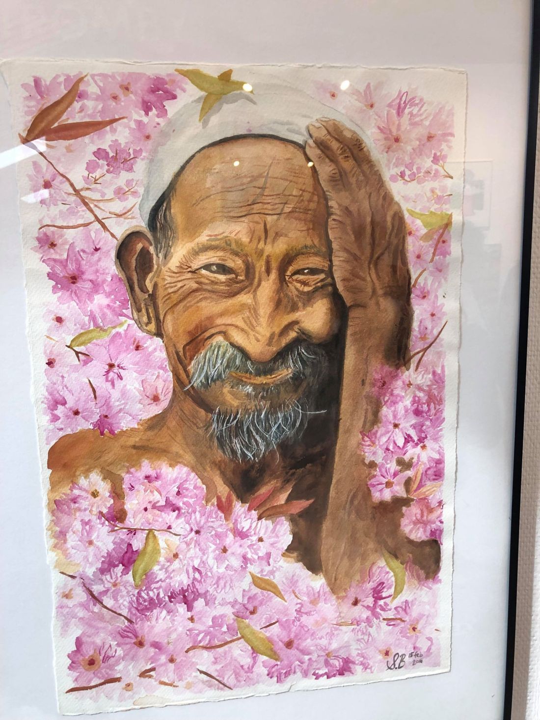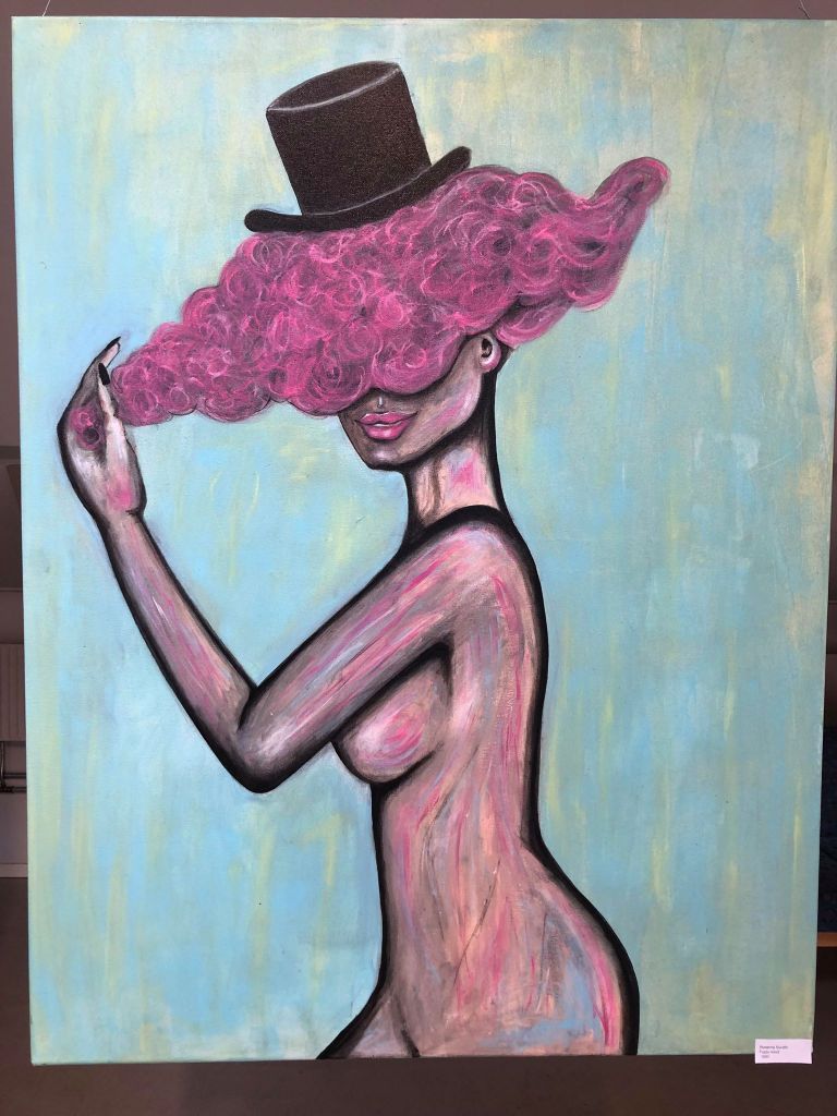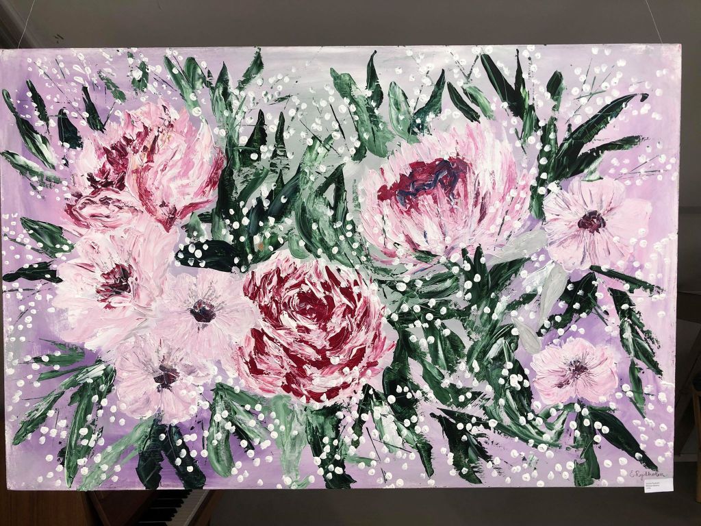 Visst är konstverket på mannen omgiven av rosa blomster underbart?! Den är målad av Sarah Billengren.