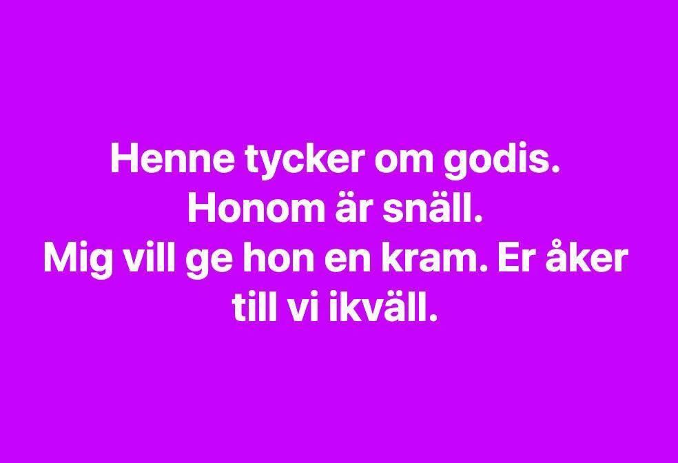 Meningarna i rutan bör skrivas enligt följande: Hon tycker om godis. Han är snäll. Jag vill ge henne en kram. Ni åker till oss ikväll.