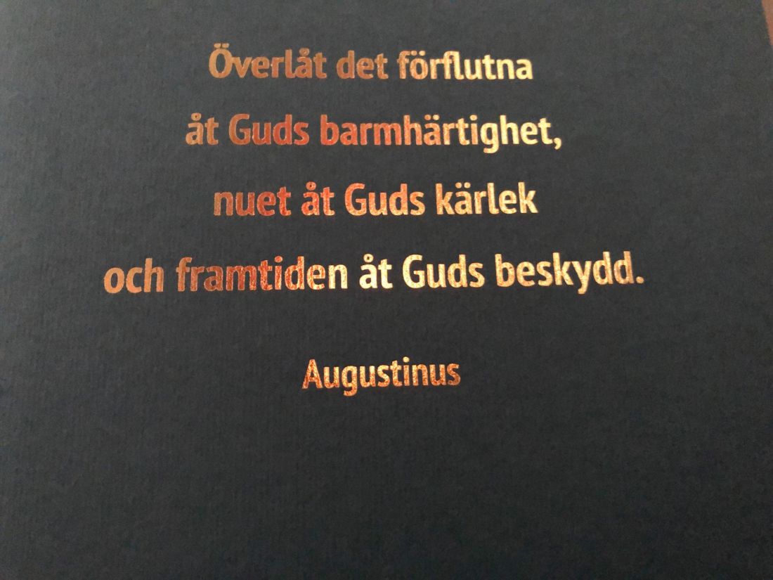 På Bokmässan köpte jag några små anteckningsblock för att ge bort till vänner som behöver detta ljuvliga budskap. Idag när jag tog fram dem insåg jag att budskapet i högsta grad gäller mig själv. Det är så lätt att fundera på olika händelser man varit med om och även hur framtiden kommer att se ut. Nuet är det enda vi har och det är nu vi lever. Så skönt att, precis som det står på boken, få överlåta det förflutna åt Guds barmhärtighet, nuet åt Guds kärlek och framtiden åt Guds beskydd. Vänner, låt oss ta vara på dagen idag!