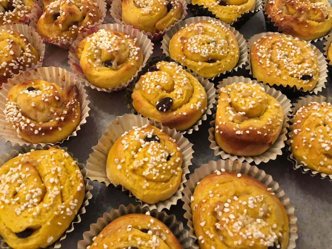 Jag började att baka två mjuka saffranskakor som jag tycker är riktigt goda. Mitt recept har jag på ett urklipp från Apotekets bästa saffransrecept. Ifall du vill testa att baka kakan så finns receptet här: https://www.recepten.se/recept/saffranskaka.html Sen blev det 71 saffransbullar, vanliga bullar fast med saffran, mandelmassa och russin. De blev goda.