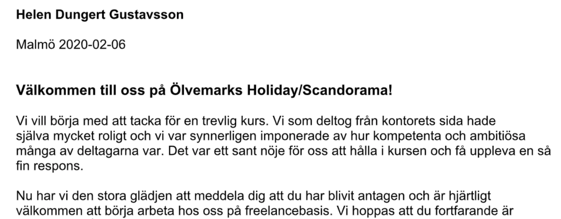 Idag på morgonen fick jag mail från dem. Gissa om jag blev nervös! Jag visste inte om jag skulle våga öppna mailet men gjorde det förstås. Hjärtat bankade snabbt för jag vill så gärna göra detta. Jag fick ett glädjande besked. Jag har gått vidare och kommer att få åka till Malmö på vidare utbildning då det även blir kick off för hela reseledarkåren. Jag är så otroligt glad, tacksam och taggad för detta.