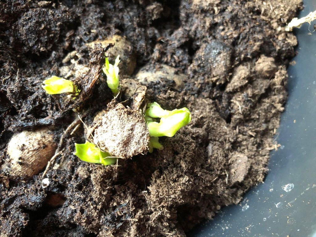 På trädgårdsmässan, för ett par veckor sen, passade jag på att köpa ett antal dahlialökar i tre olika färger. Jag planterade dem i stora krukor för nio dagar sen och placerade dem i vårt gästrum tillika kontor där de tar en del plats. Senast igår kväll inspekterade jag dem men inget hade hänt. Jag funderade på om jag hade lagt på för lite jord och bestämde mig för att lägga på lite mer.