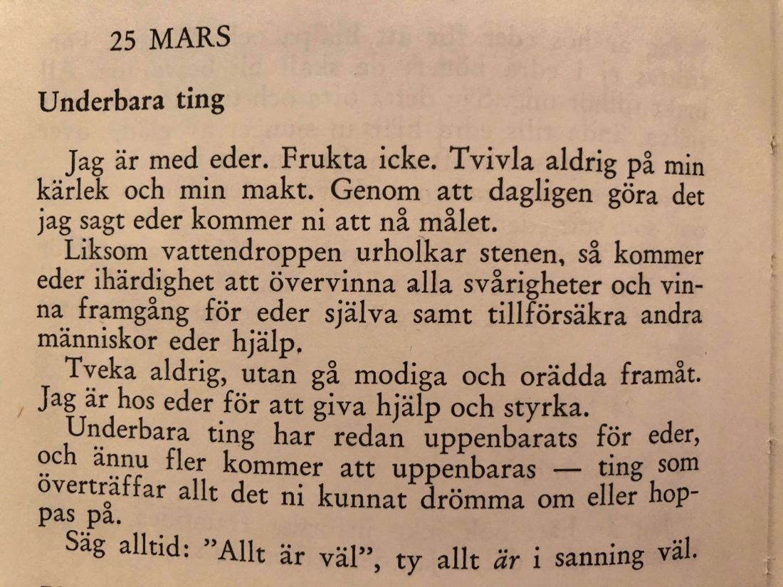 Underbara ting Jag är med eder. Frukta icke. Tvivla aldrig på min kärlek och min makt. Genom att dagligen göra det jag sagt eder kommer ni att nå målet. Liksom vattendroppen urholkar stenen, så kommer eder ihärdighet att övervinna alla svårigheter och vinna framgång för eder själva samt tillförsäkra andra människor eder hjälp. Tveka aldrig, utan gå modiga och orädda framåt. Jag är hos eder för att giva hjälp och styrka. Underbara ting har redan uppenbarats för eder, och ännu fler kommer att uppenbaras – ting som överträffar allt det ni kunnat drömma om eller hoppas på. Säg alltid: ”Allt är väl”, ty allt är i sanning väl.