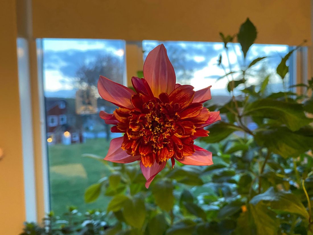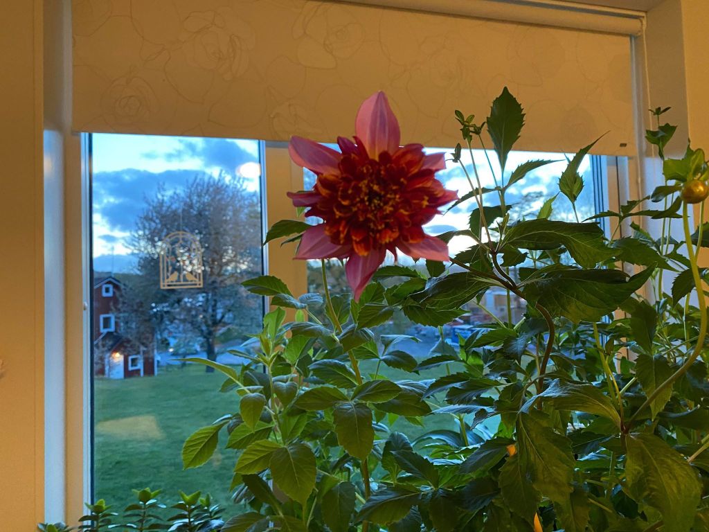 Nu har det hänt. Den första dahliablomman har slagit ut. Det hände medan jag var i Nybro. Så roligt att komma hem till detta. Jag förväntar mig massor av blommor.