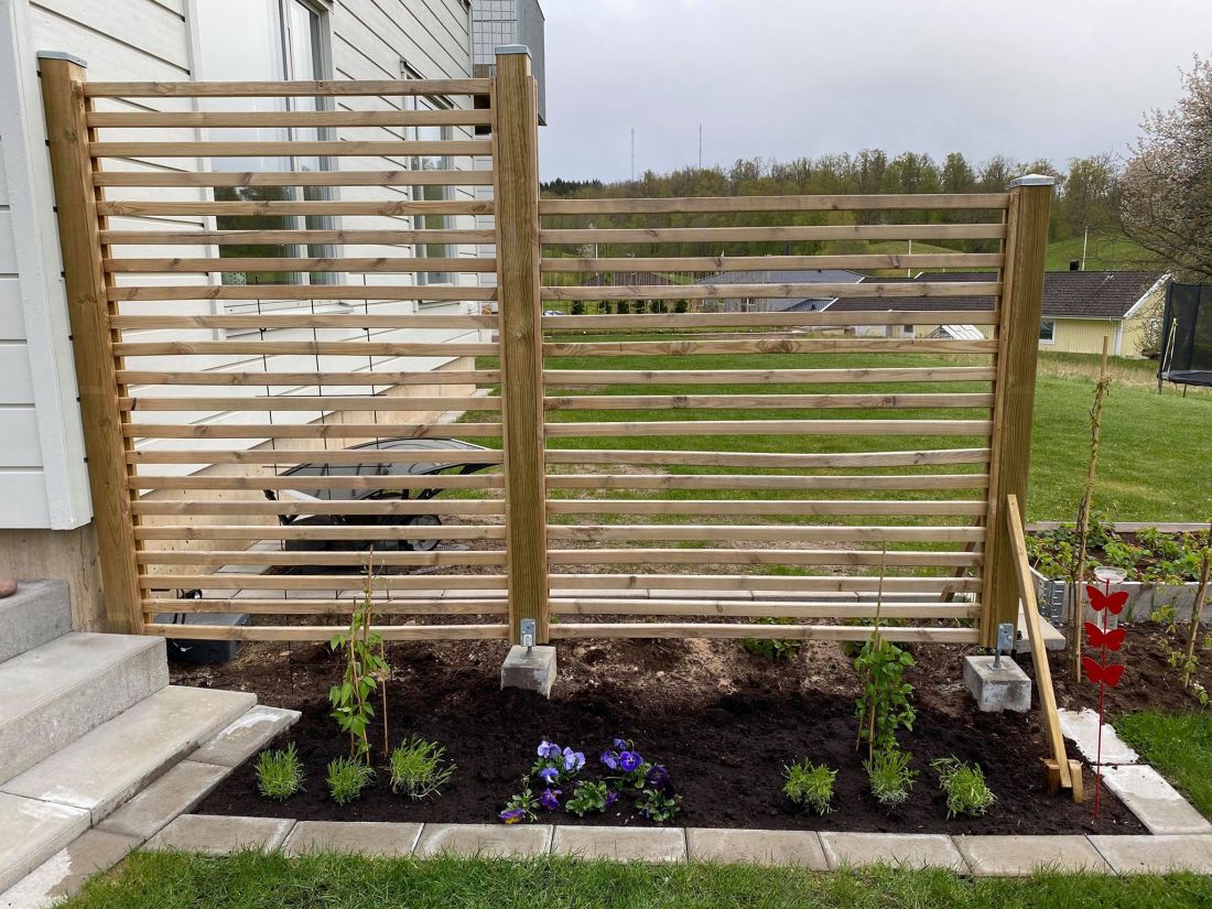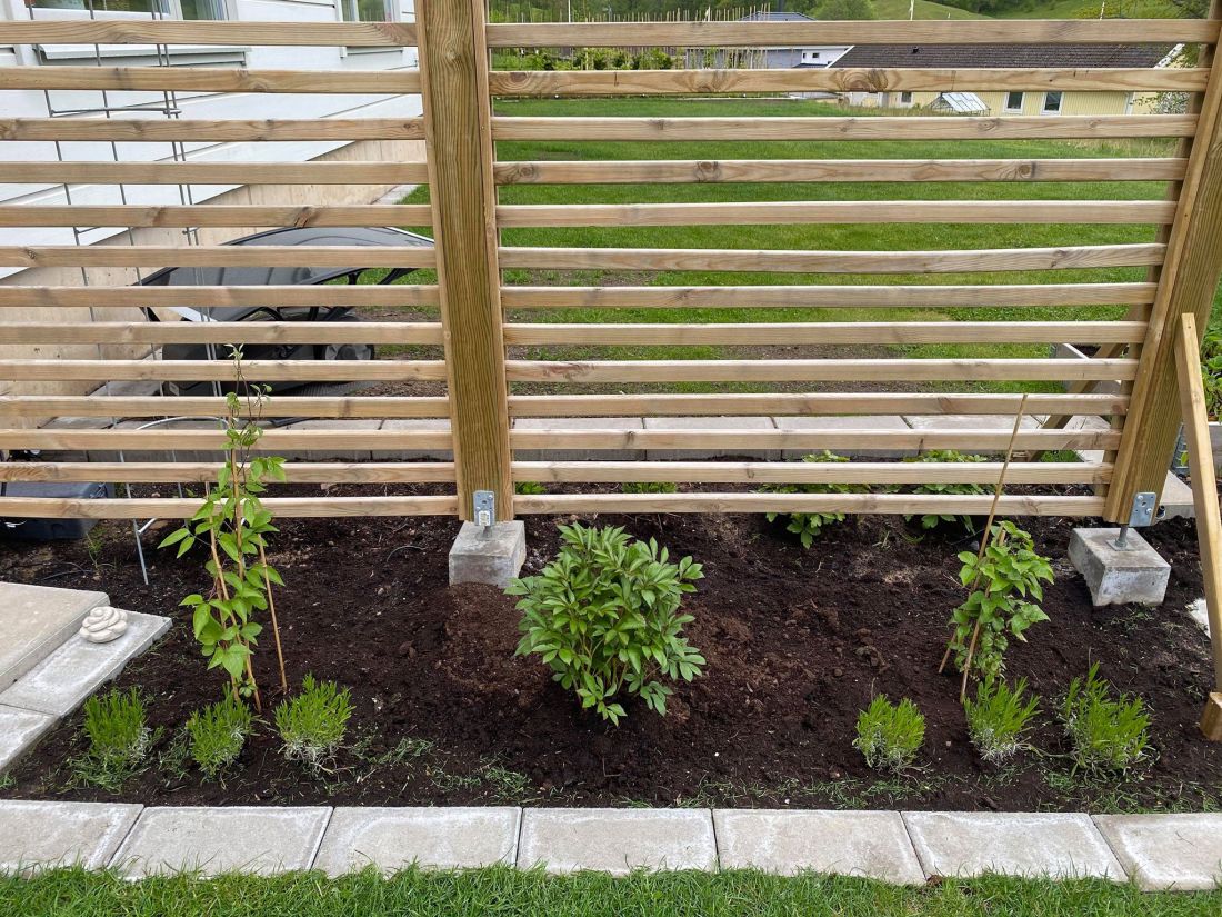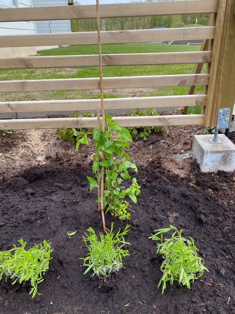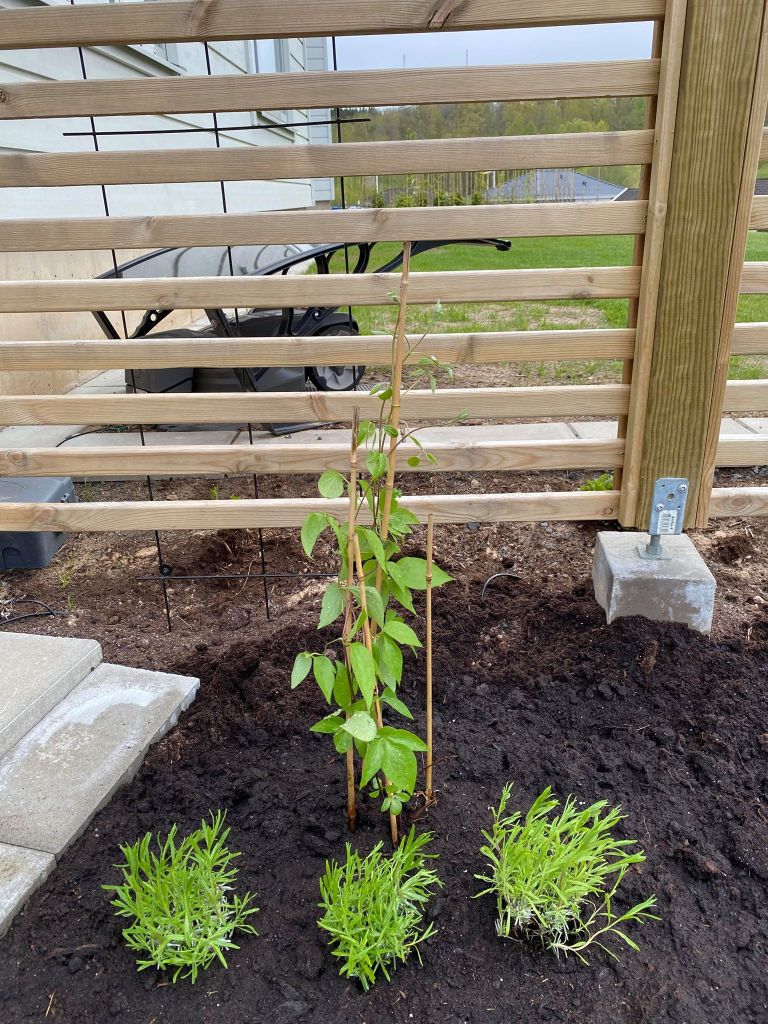 Nu börjar blomlandet ta form. Två olika sorters klematis är planterade. Framför dem har jag planterat lavendel och nu finns även en pion i mitten. Detta ska bli så roligt att följa. Jag är förväntansfull.