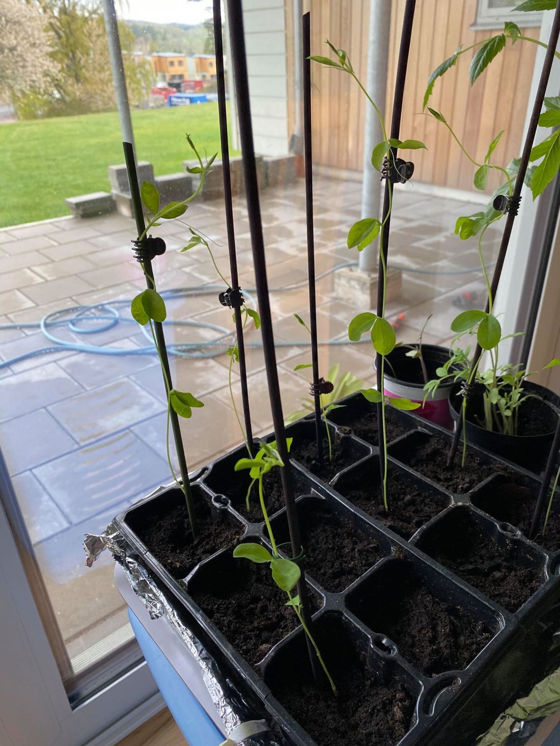 Jag sådde luktärtsfrön för första gång i vår och nu börjar de växa. De är så rangliga och lade sig ner ganska snabbt. Jag konsulterade min goda vän Yvonne som är en van luktärtsodlare. Hon rekommenderade att stötta upp dem med grillpinnar. Jag hittade andra blomsterpinnar här hemma och har stöttat upp dem med det. Hoppas det blir bra. Roligt att se hur det växer.