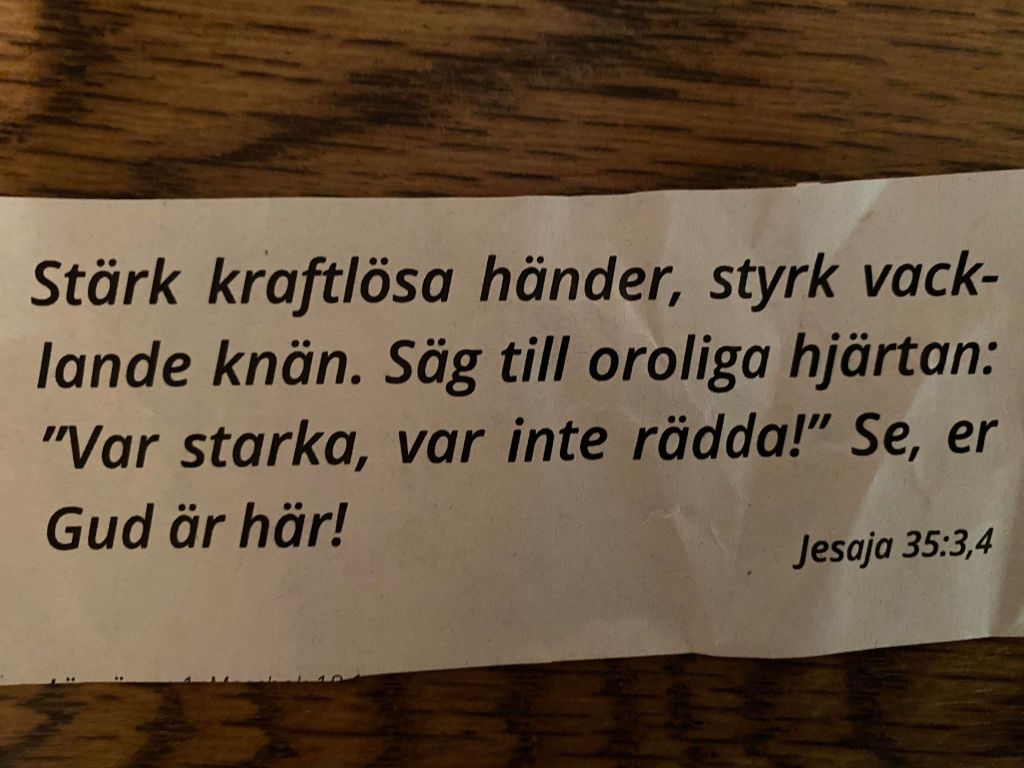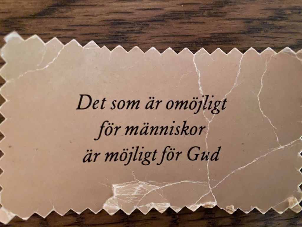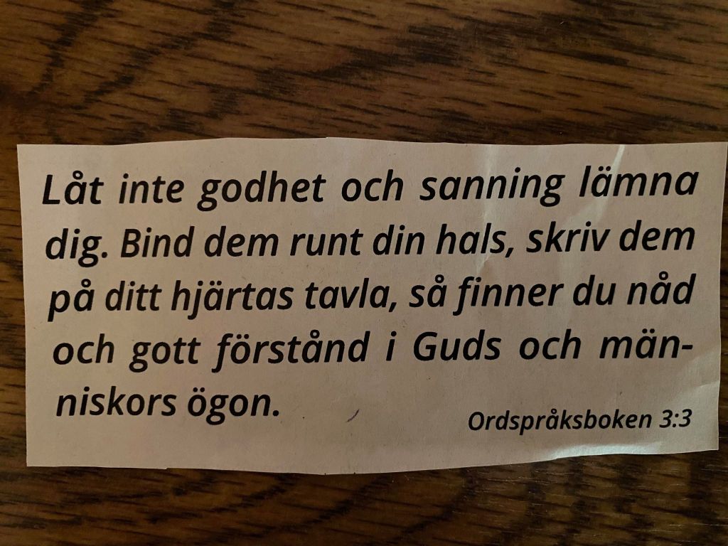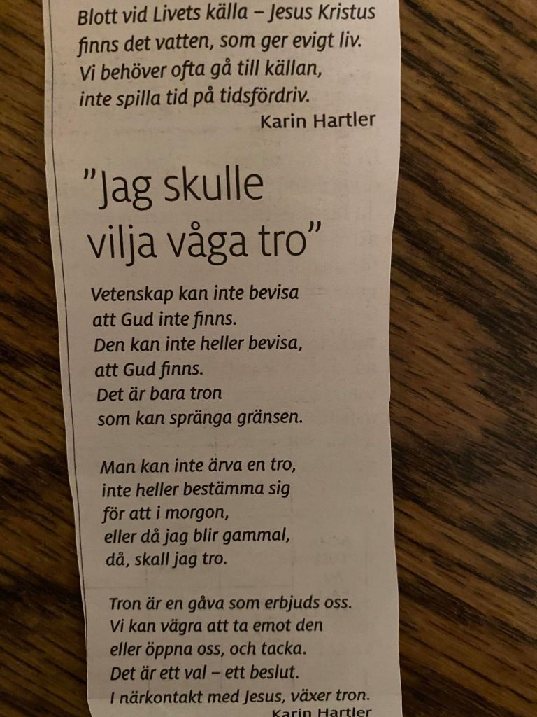 Efter mammas 90-årsfirande blev hon orolig i hjärtat och fick åka till sjukhuset. Hon blev inlagd under fem dygn men är nu åter hemma. Medan jag var kvar i hennes hem några dagar kunde jag inte undgå att se alla lappar hon har liggande på lite olika ställen. Det är små kort, urklipp och saker hon skrivit själv. Jag vill dela med mig av vissa lappar här för de ger mig energi. Läs och ta till dig av budskapet om du vill.