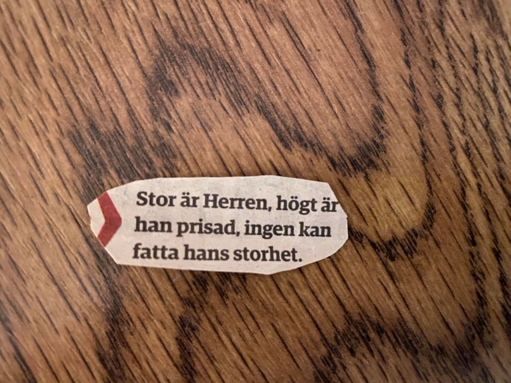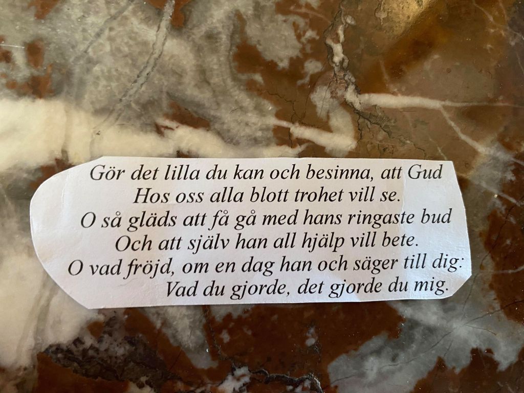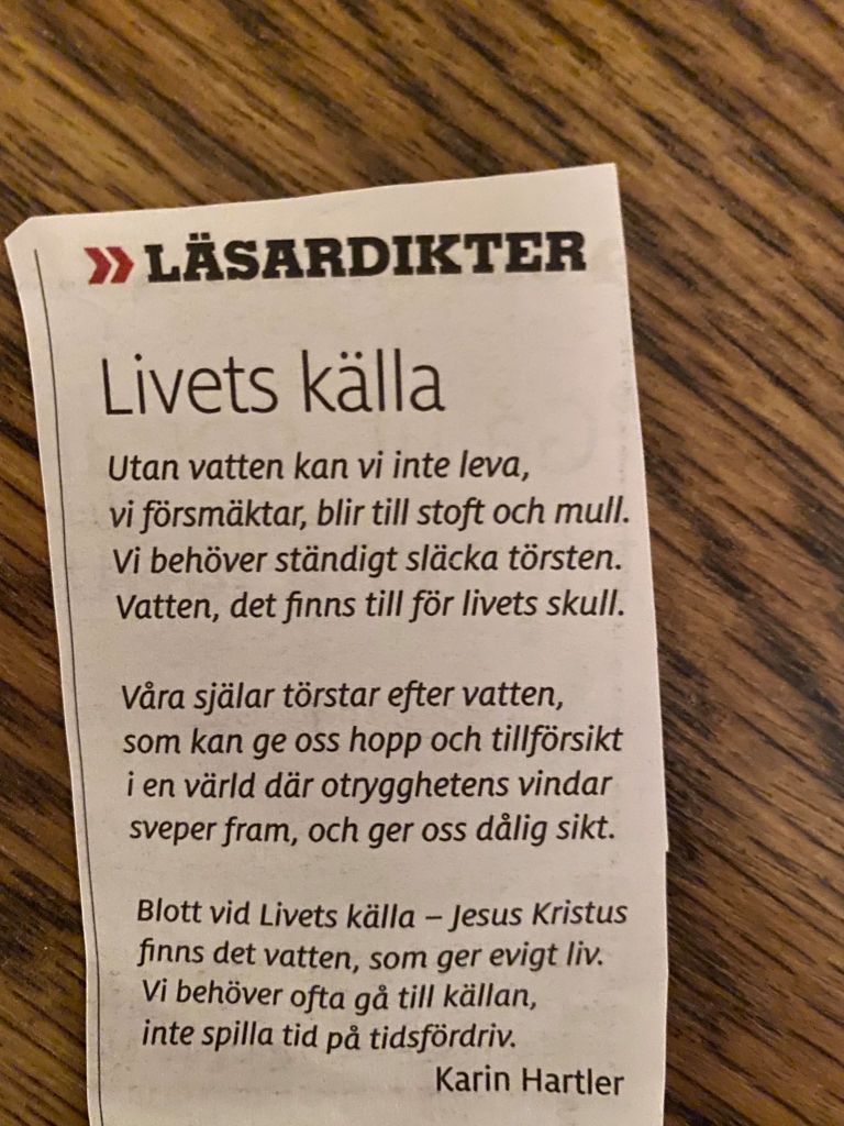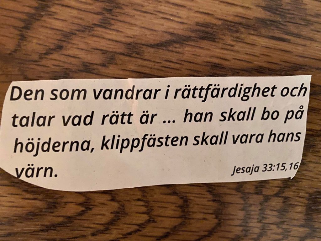 Efter mammas 90-årsfirande blev hon orolig i hjärtat och fick åka till sjukhuset. Hon blev inlagd under fem dygn men är nu åter hemma. Medan jag var kvar i hennes hem några dagar kunde jag inte undgå att se alla lappar hon har liggande på lite olika ställen. Det är små kort, urklipp och saker hon skrivit själv. Jag vill dela med mig av vissa lappar här för de ger mig energi. Läs och ta till dig av budskapet om du vill.