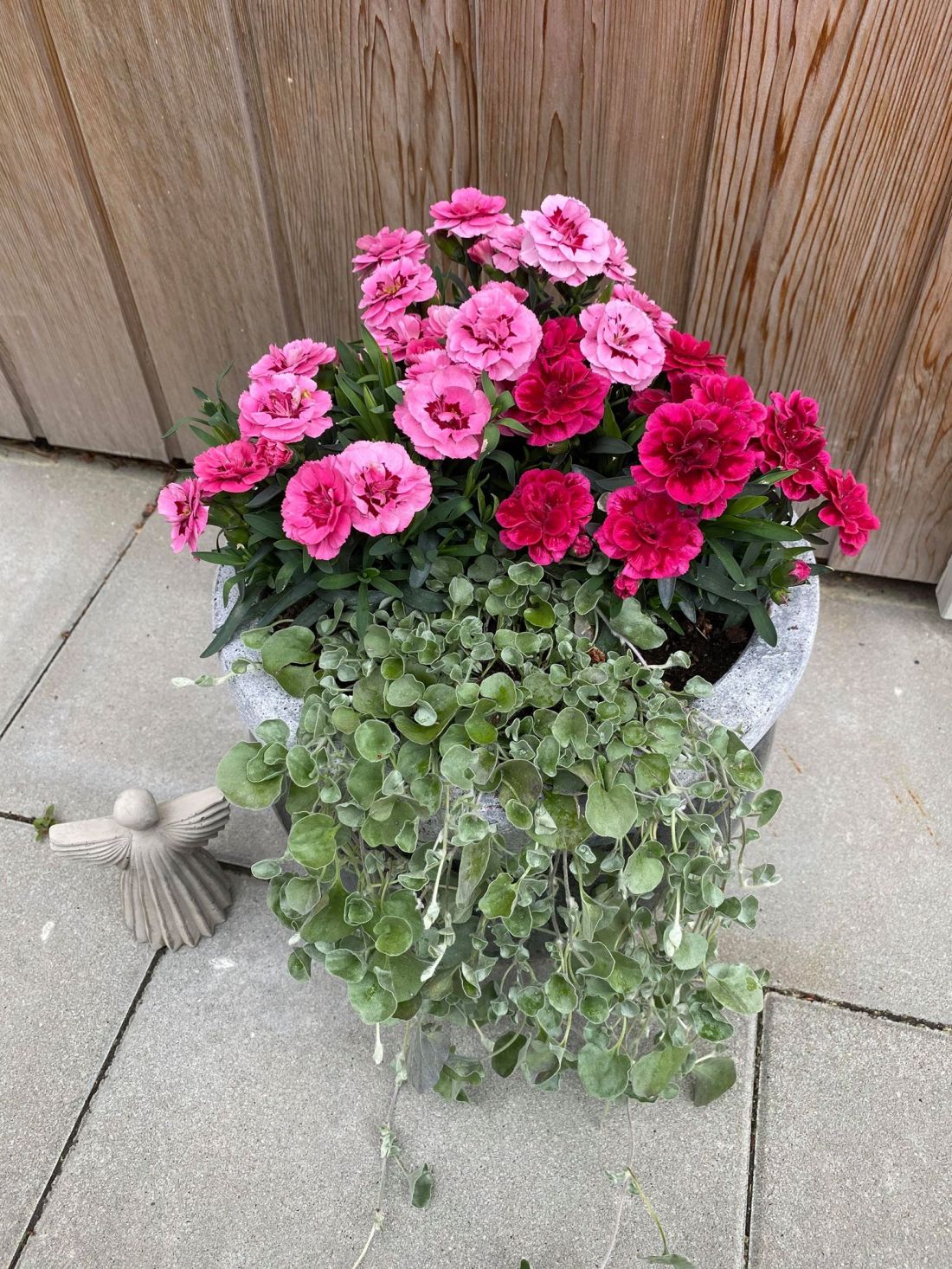 Jag köpte en ny kruka att ha vid entrén. Jag planterade bl.a. trädgårdsnejlika som jag tycker har blivit så fin i sina två färger. Jag älskar rosa och cerise. Tänk vad blommor kan glädja en människa!