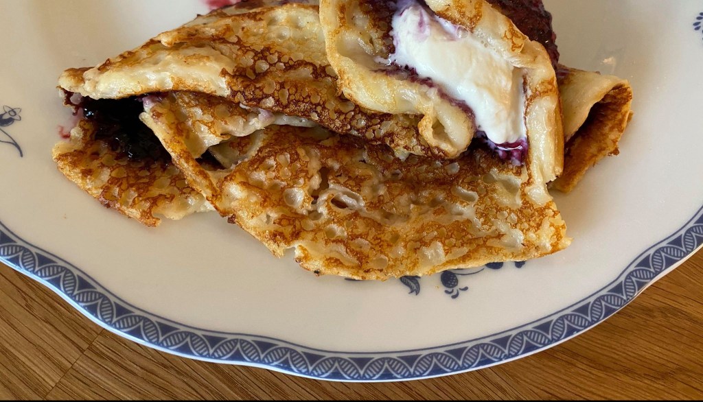 Ikväll serverade jag pannkakor med grädde och blåbärssylt så att maken fick göra sin egen pannkakstårta. Ja, tårta kanske det inte blev men det blev en god blandning av pannkakor, grädde och blåbärssylt. Han gillade det.