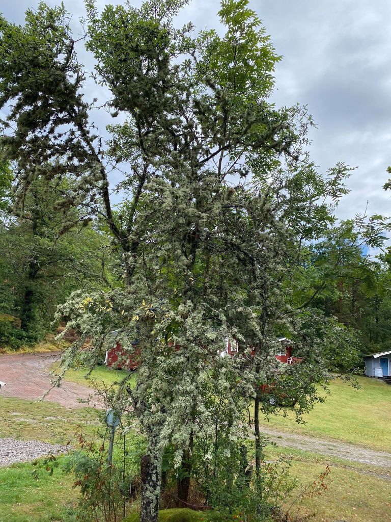 Vid naturcampingen fanns detta slånbärsträd. Jag fascinerades av dess talrika lav men läser att det är vanligt med så mycket slånlav i södra Sverige. https://sv.wikipedia.org/wiki/Sl%C3%A5nlav