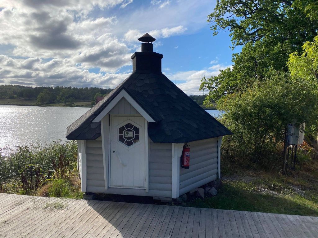 Väl hemma på land var det dags att inmundiga exotisk planka. Det smakade gott efter den 2,5 timmes långa havsturen. Efter mörkrets inbrott var det dags för bastubad – vedeldad bastu i denna lilla stuga. (Se nedan.) Jag kände mig lite frusen efter båtturen och efter att ha suttit och ätit exotisk planka ute i den lite svala kvällen. Jag hade inte så höga förväntningar inför bastubad och havsbad men kände ändå att jag ville vara med på detta. Jag kan säga att jag inte blev besviken. Vi värmde upp oss länge i bastun och sen bar det iväg ner på bryggan för ett dopp. Det var månsken från en nästan full måne och det gick lätt att doppa sig. Upp i bastun igen och så ner i havet. Det var helt underbart.