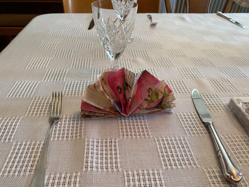 Mamma känner sig ganska trött men hon dukade så vackert. Idag blev det servettvikning i form av solfjädrar. Det är de små detaljerna som gör det. Nu har vi trätt ännu en sött smultron på vårt gemensamma livsstrå.