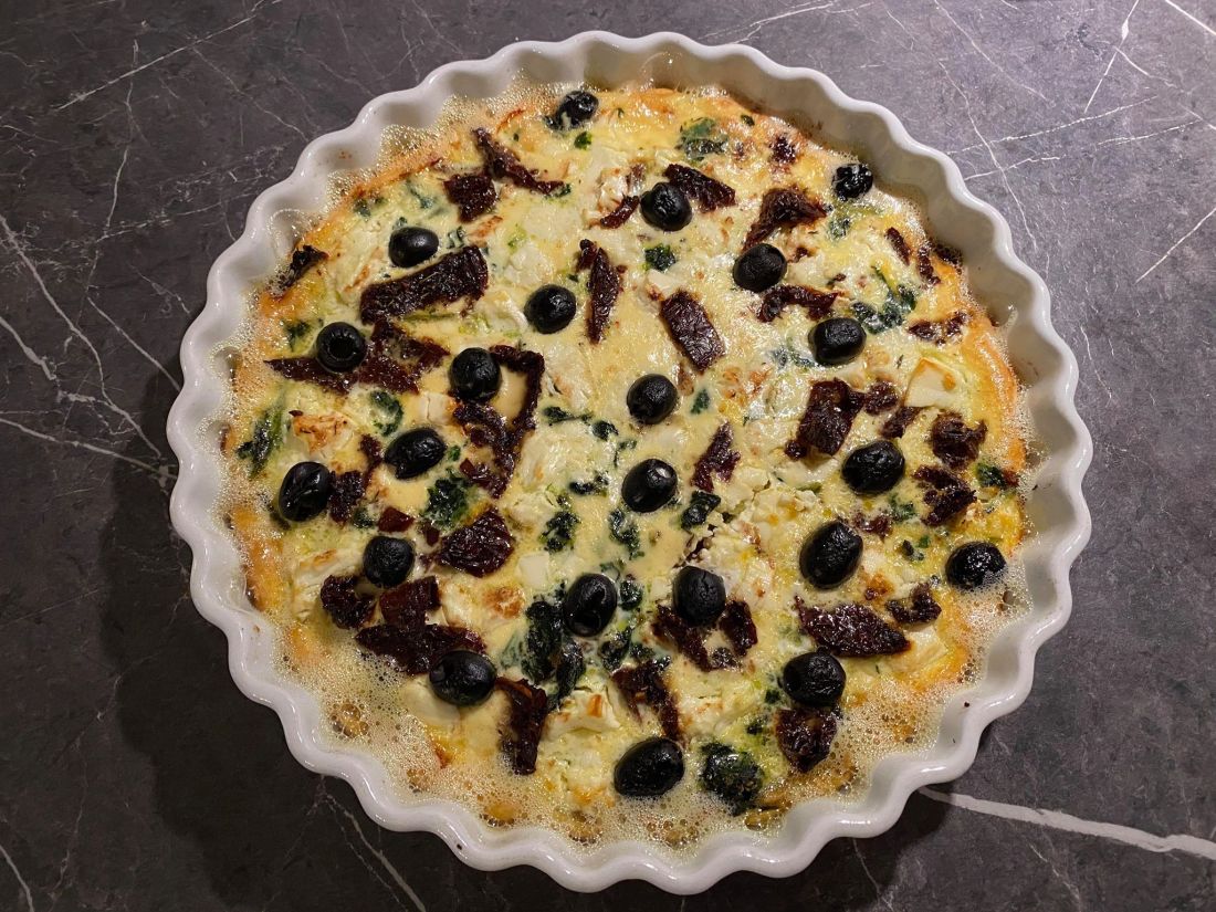 Imorgon kommer en gammal kompis hit och jag skulle förbereda något att äta. Hon äter inte kött så jag ville göra en vegetarisk paj. Det blev fetaostpaj med oliver och soltorkade tomater. Det är ett ganska nyttigt recept och jag är rädd att det är så nyttigt att det inte blir gott men jag ville testa detta. Det är inget smör i pajdegen utan bara olivolja blandat med grahamsmjöl, vetemjöl, ägg, salt och vatten. I fyllningen är det en hel del goda grejer men själva äggstanningen är gjord av ägg och vatten. Här finns receptet om du är intresserad. https://www.zeta.nu/recept/fetaostpaj-med-oliver-och-soltorkade-tomater/