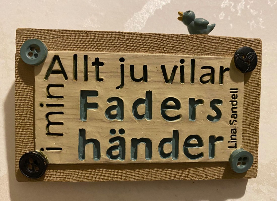 Denna ljuvliga lilla tavla fick jag se ikväll när jag var på besök hos min goda vän Helena. Texten lyder: Allt ju vilar i min Faders händer. Jag tror många känner igen strofen som är hämtad från sången Blott en dag ett ögonblick i sänder. Det är en underbar sång som passar att sjunga i livets olika skiften. Vi kan bara ta en dag i taget och Gud är med oss i varenda litet steg vi tar. Jag väljer att helt lägga mitt liv i Guds hand. Jag litar på att han leder mig steg för steg, dag för dag. Det är en trygghet.