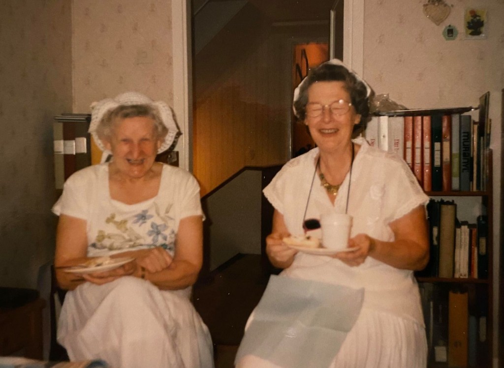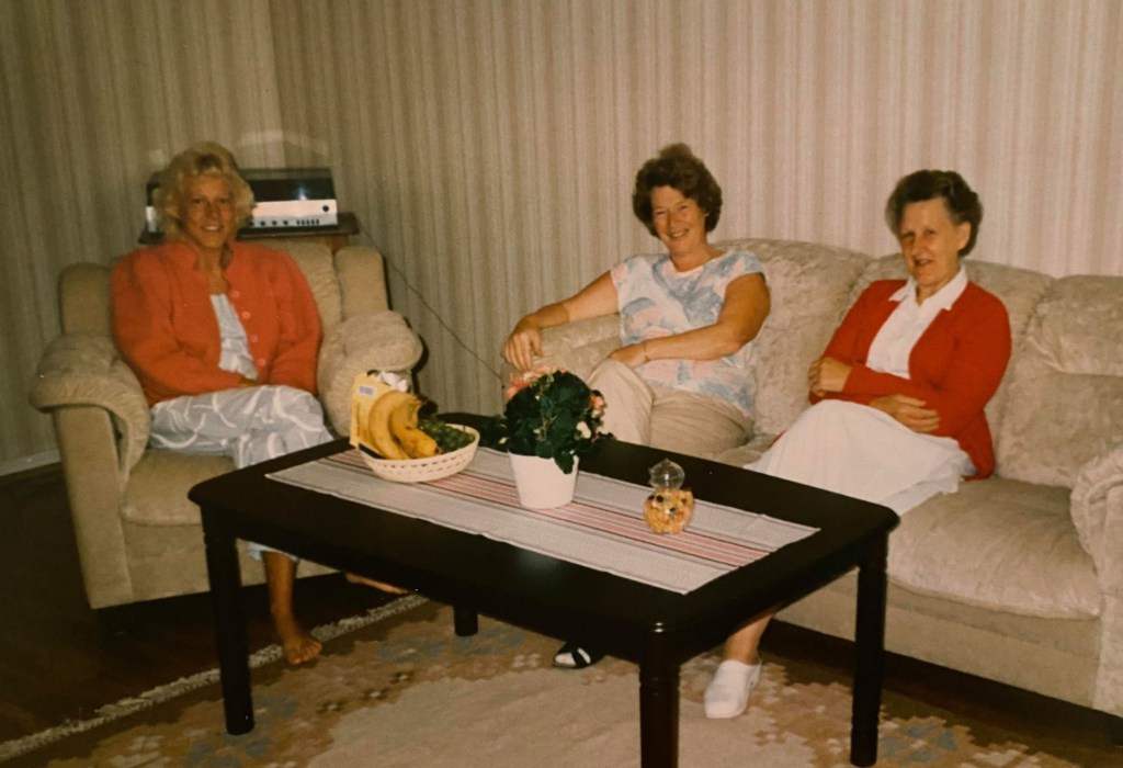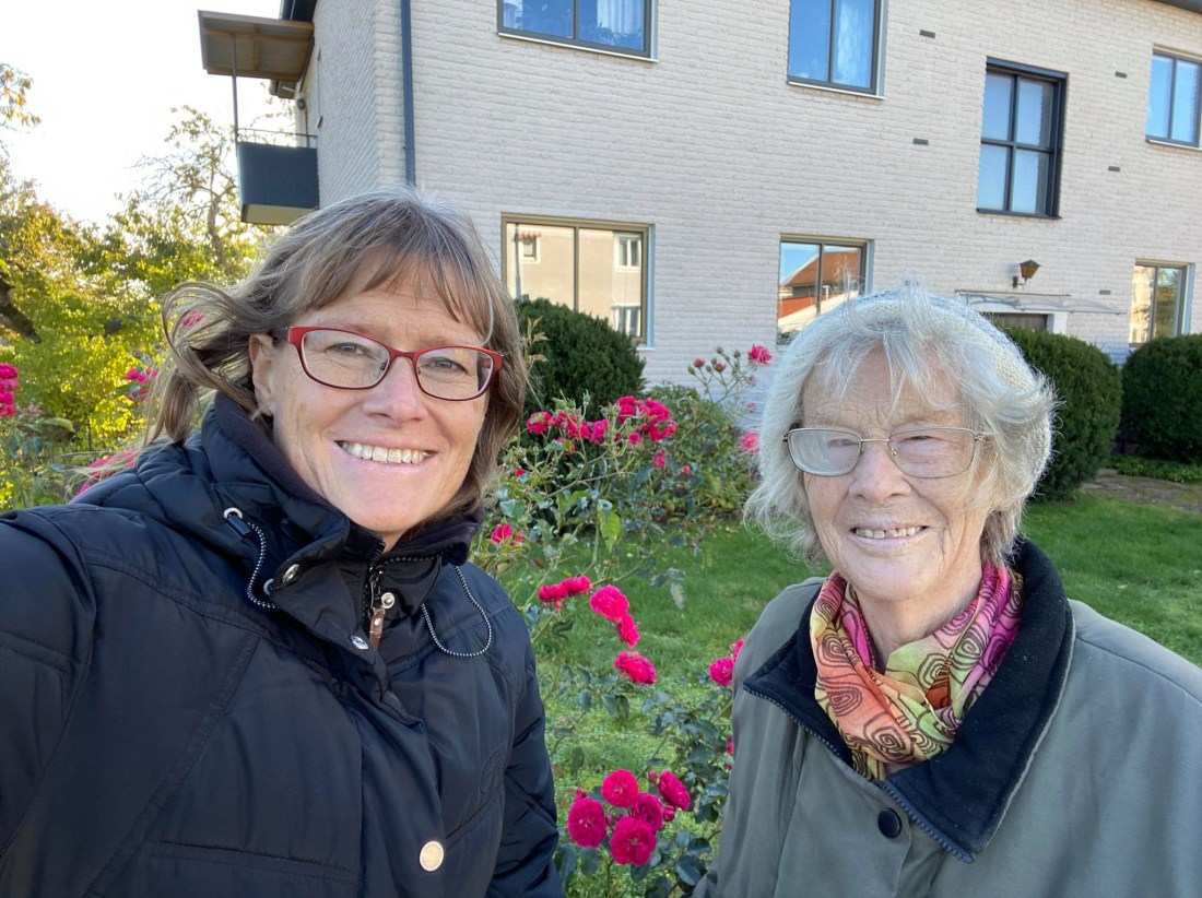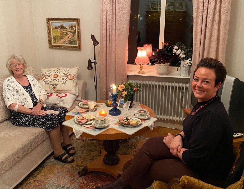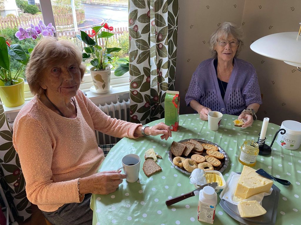 Det blir ofta förmiddagsfika med hennes goa grannar Inga och Sigbritt. Då passar jag också på att ta mig några minuter ledigt. Dessa små stunder med en fika och härligt prat betyder mycket.