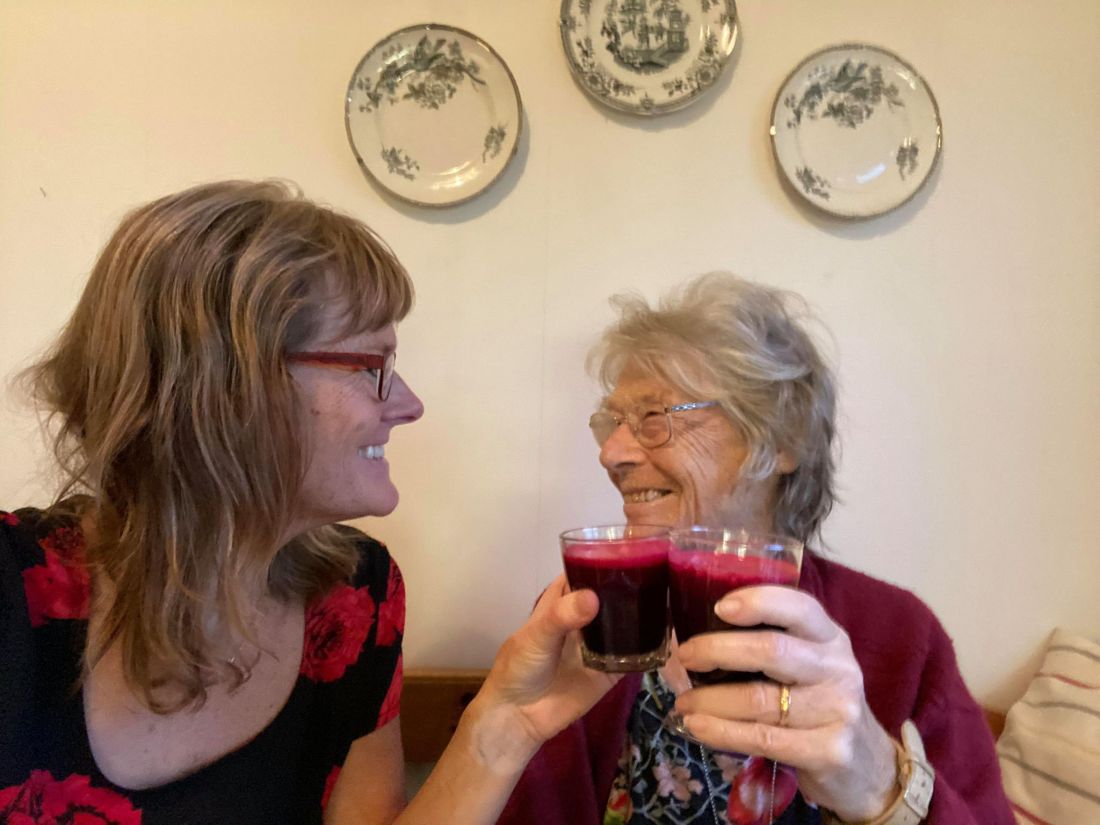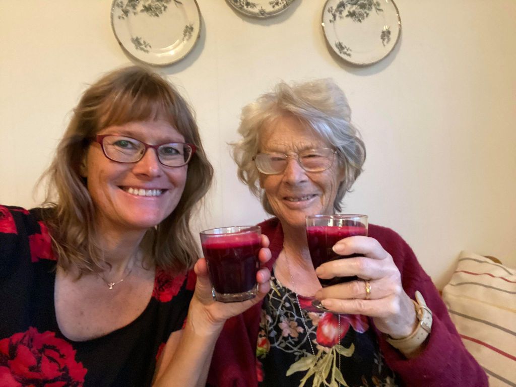 Jag lagade middag och vi skålade med rödbetsjuice. Jag har tagit med min råsaftcentrifug hem för jag vill boosta både mamma och mig med nyttiga drycker. Skål för livet vi lever nu!