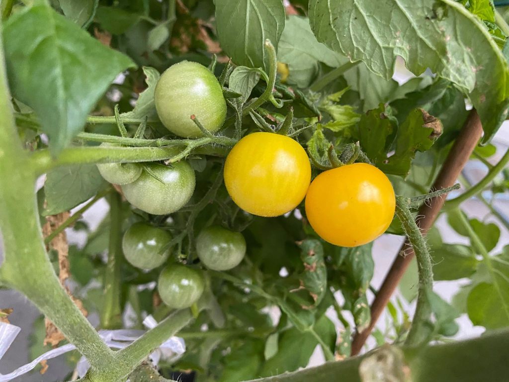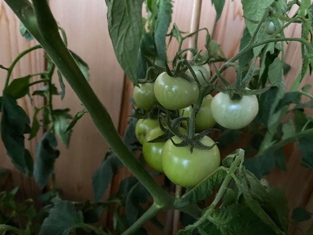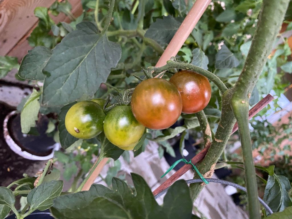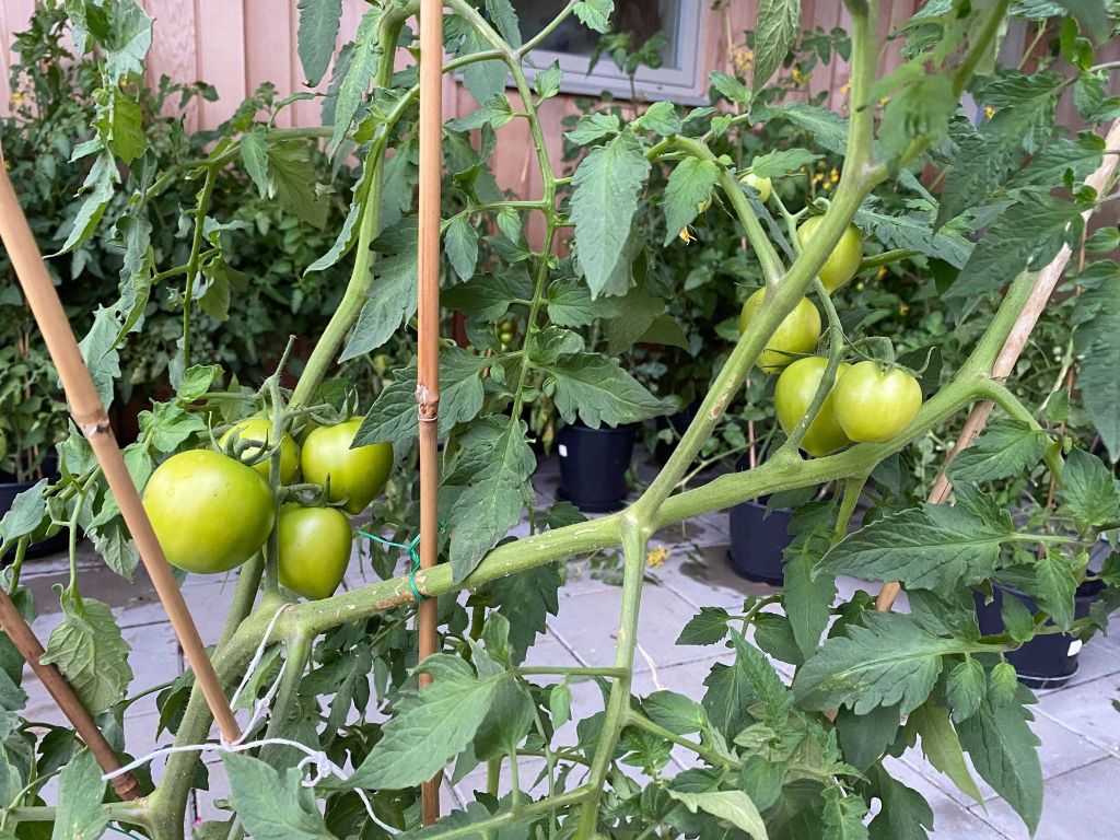 Ikväll var det dags att skörda de tomater jag odlat från grunden genom att lägga tomatskivor direkt i jord, ett projekt som gett mig glädje. Från början var plantorna små och rangliga och jag var lite tveksam till om det skulle bli något av dem. Jag stöttade upp dem med pinnar så gott jag kunde.
