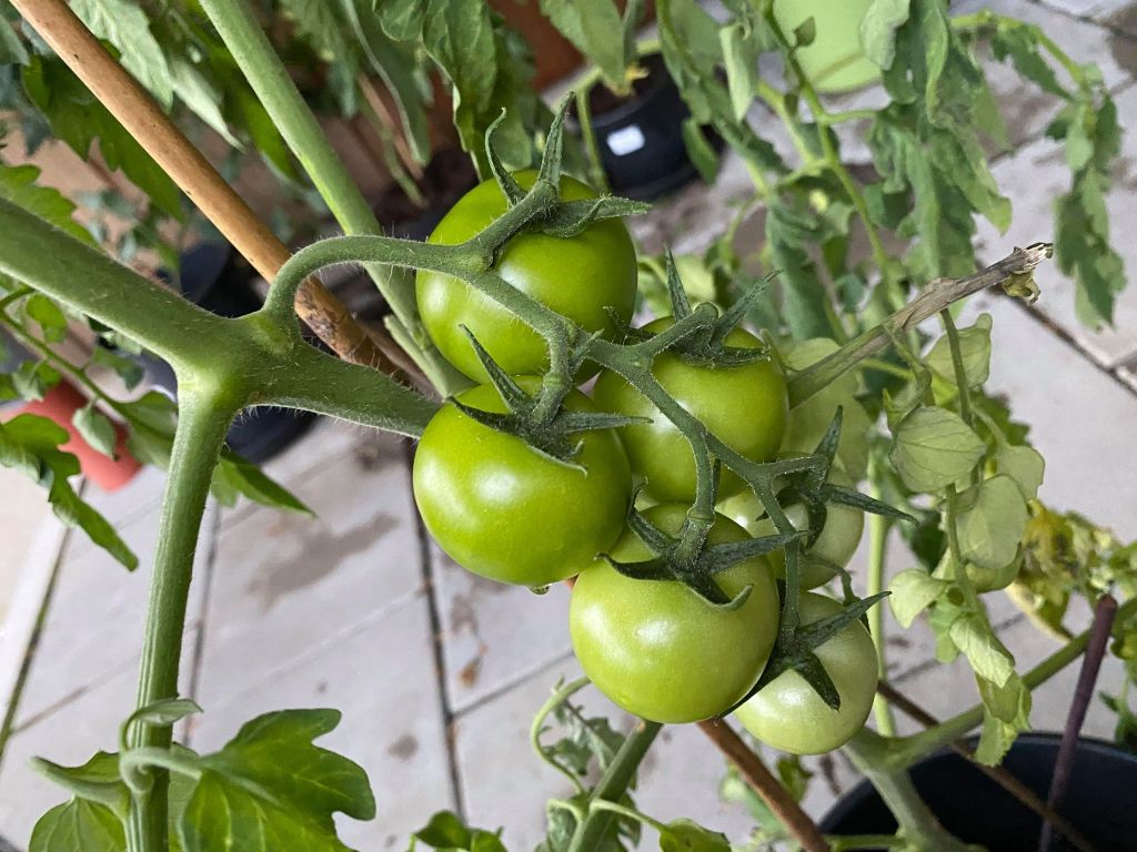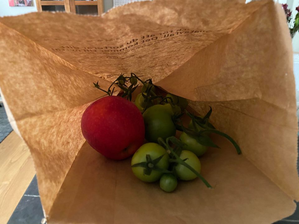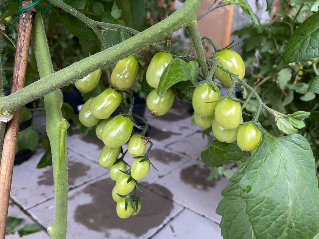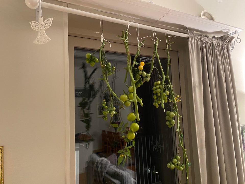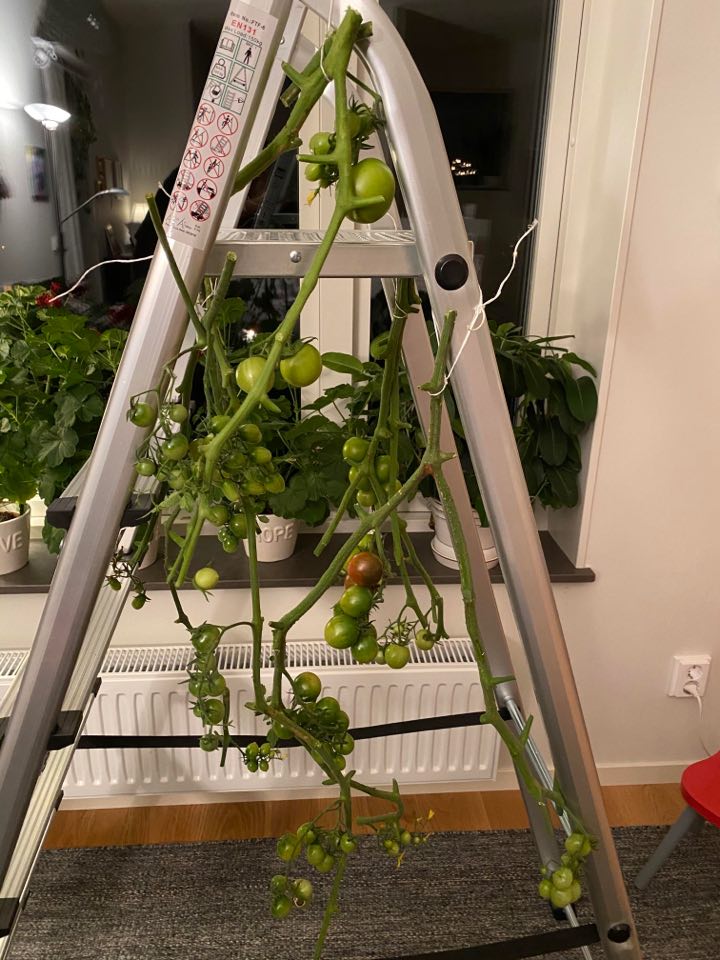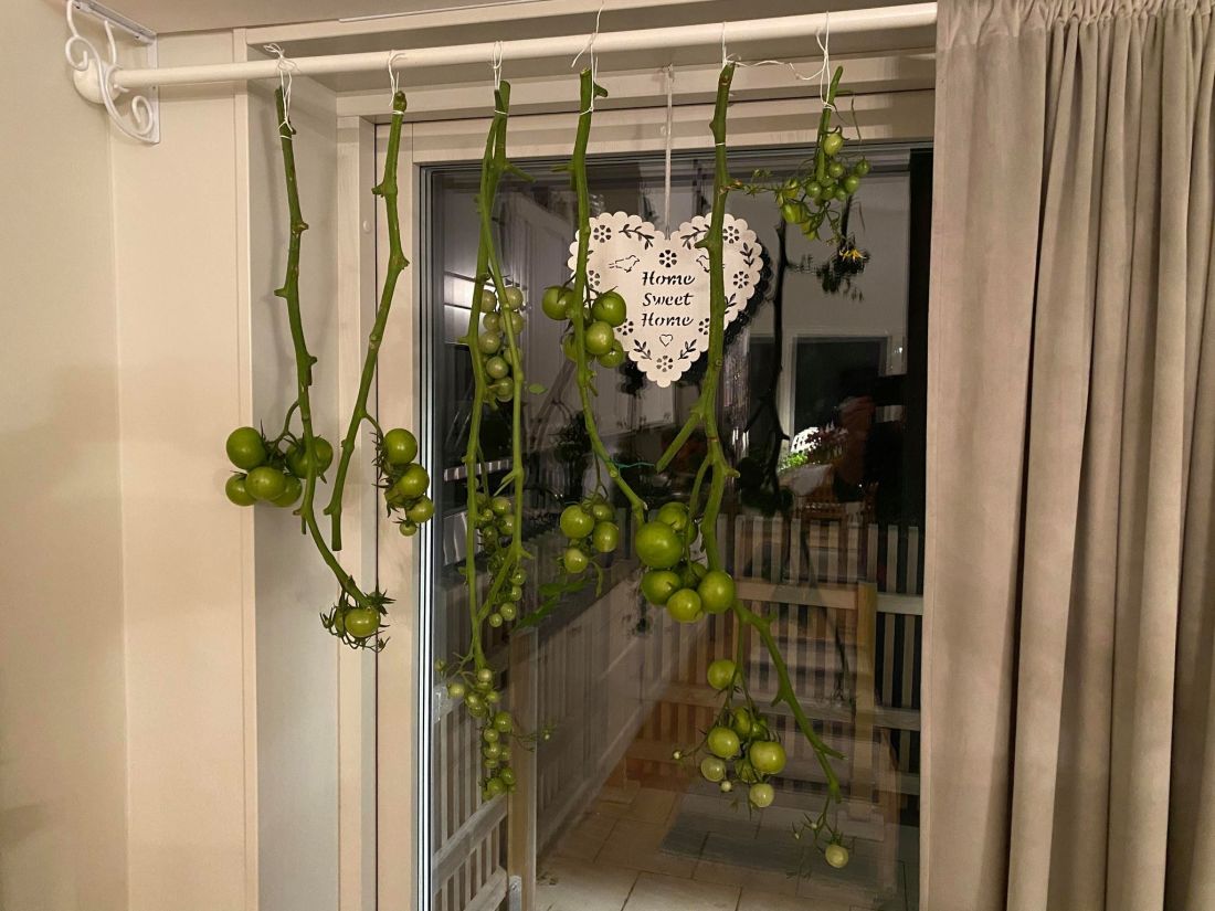 Jag har fått tips av mina vänner hur man ska göra för att få dem att mogna och jag har anammat dessa idéer. Nu hänger de flesta tomater på sina kvistar och några ligger i papperspåse tillsammans med ett äpple för att mogna. Hoppas jag gjort rätt!