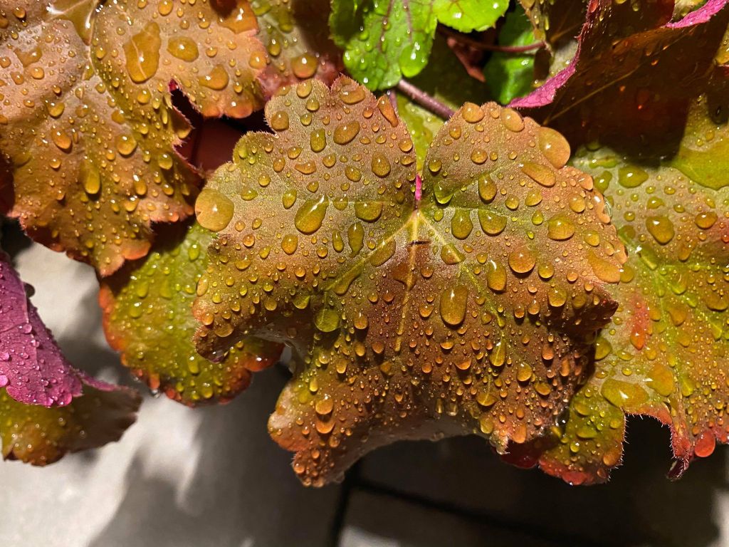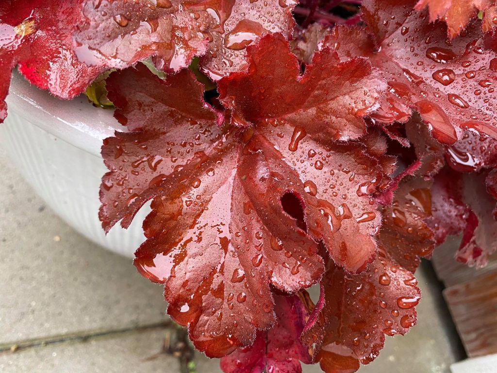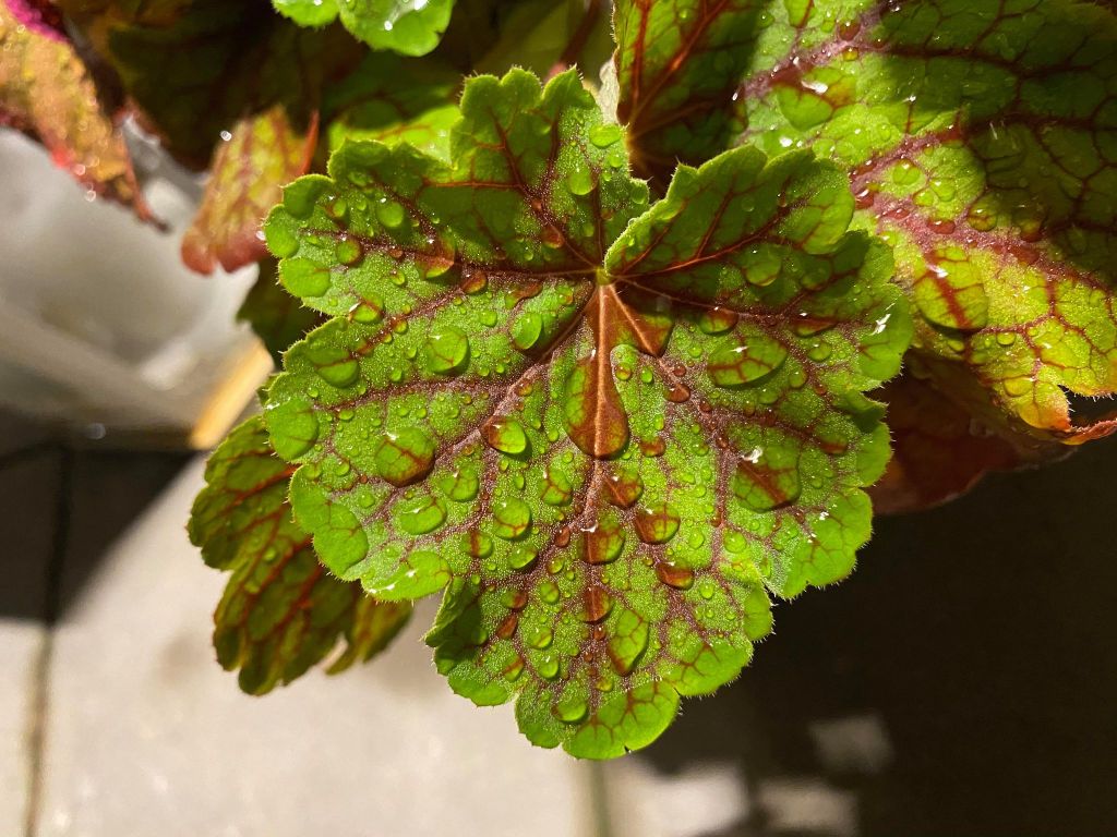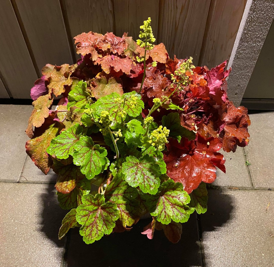 Det är första gången jag planterar alunrot. Jag köpte tre olika sorter som jag satte ihop i en kruka. Jag tycker de är så härliga och har så fina mönster. Titta så vackra de är när det har regnat. Detta gör mig glad.