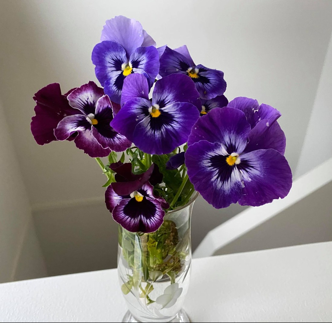 Jag tog bort mina penséer från framsidan av huset för en tid sen men jag hade inte tid att slänga dem då så de har stått på en avskild plats. Även om de börjar bli lite skraltiga så blommar en del fortfarande. De är otroligt vackra. Jag plockade en bukett och ställde i en vas. Visst blir man glad?