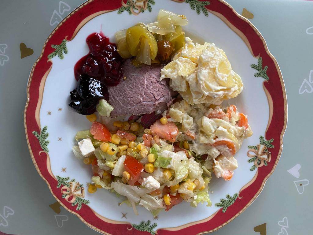 Maken hade med älgkött och älgfärs till Tallkullen igår och han har tillrett tjälknöl till söndagsmiddagen. Vi gjorde det lätt för oss och köpte Pekas färdiga gratäng, både rotfruktsgratäng och potatisgratäng. Dessa är jättegoda och det går snabbt att få maten klar. Vi avnjöt en god måltid. Några matlådor lär det också bli. Till efterrätt intogs blåbärspaj (som fanns i frysen) och vaniljsås samt kaffe. Så bra vi har det! Hus och hem med värme, elektricitet och vatten, mat och kläder, internet, radio, TV och en massa annat. Jag är tacksam.