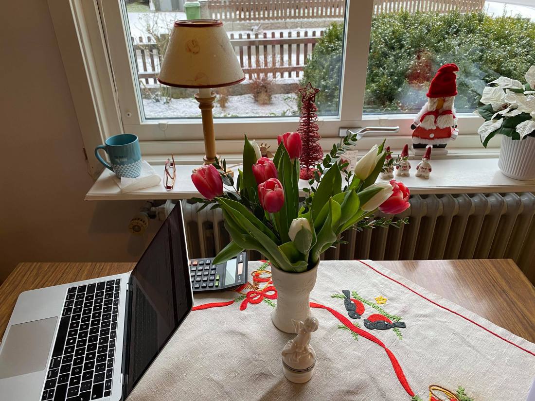 Jag arbetar från Nybro hela veckan. Här vid köksbordet är min arbetsplats och här har jag det bra. Det är toppen att kunna sitta här och arbeta och samtidigt tvätta mammas kläder under dagens gång. Hon har oerhört mycket kläder och jag vill tvätta allt innan jag skänker det. Så skönt att också ha tid att på kvällarna att fixa och greja med mammas grejer.