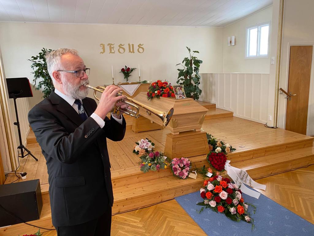 Vi fick bara vara 20 personer exklusive ljudskötare, pianist, sångare, officiant och representant från begravningsbyrån. Det blev en fin stund. Per-Erik Bernspång som var officiant talade så fint. Han spelade även två trumpetsolon. I början av gudstjänsten spelade han Jag har hört om en stad ovan molnen och precis innan bilen körde iväg med kistan och vi alla stod ute spelade han Härlig är jorden.