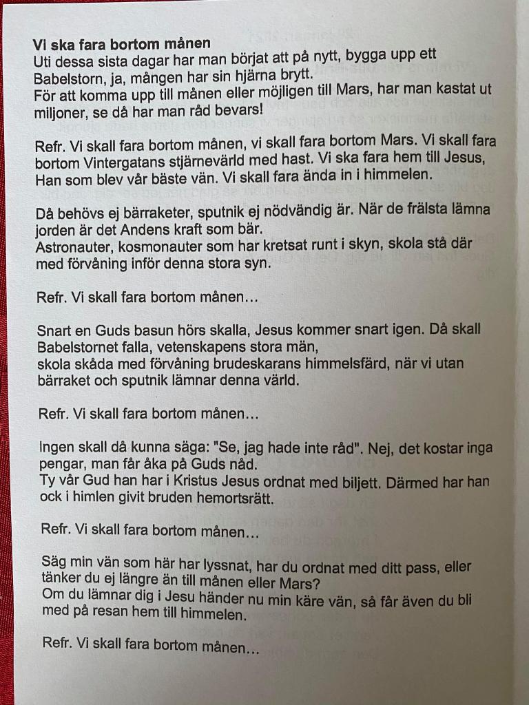 Vi sjöng två unisona sånger: Det finns djup i Herrens godhet och Pärleporten. Jag älskar strofen som avslutar varje vers: Det finns glädje bortom graven och en framtid full av sång. Vilket hopp! Det var barnbarnen som önskat Pärleporten och vers nr 4 är underbar. När en gång i livets morgon till den gyllne port jag når, då för Jesus stora kärlek och för mig den öppen står. Per-Erik skrev i ett mail följande kommentar: Det är fantastiskt att livets morgon kan börja för en dam som fyllt 90 år här på jorden och på Ulla-Britt stämmer det.