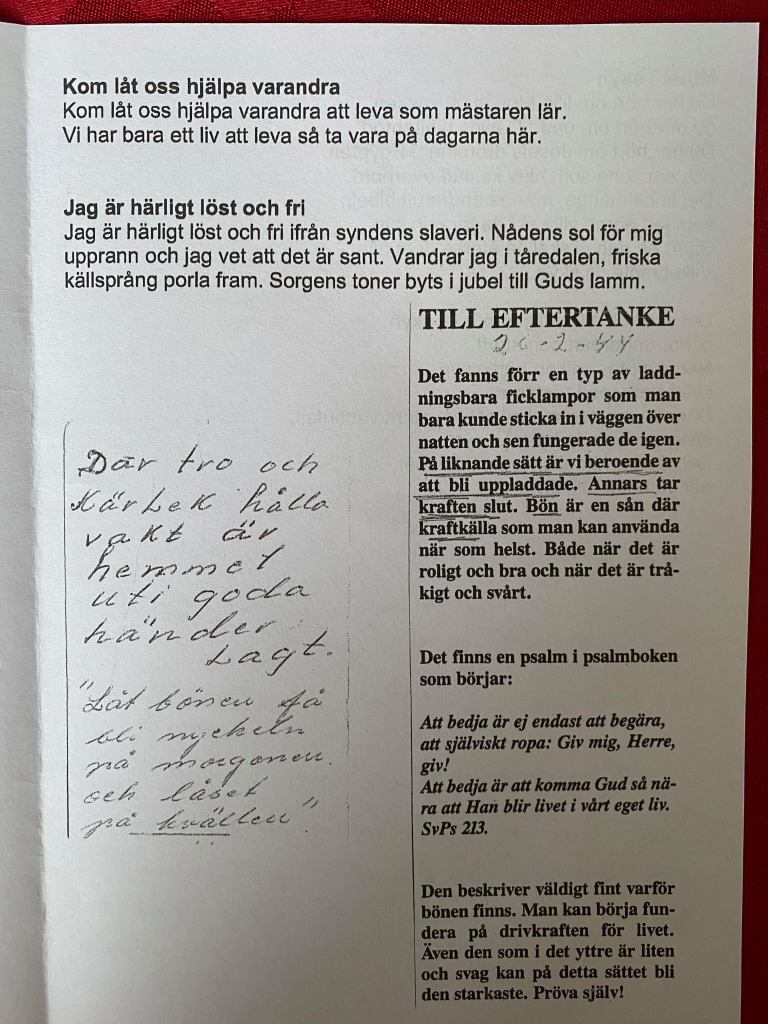 Jag hade gjort ett sångblad där jag även lagt in olika citat från mamma. Hon har många lappar liggande och jag ska gå igenom dem alla. Jag tycker det är så härliga och stärkande ord. Det kändes så bra att få ha med några av hennes egna tankar i sångbladet. Jag lade också in något av hennes urklipp. Texten som står under TILL EFTERTANKE tycker jag är kanonbra.